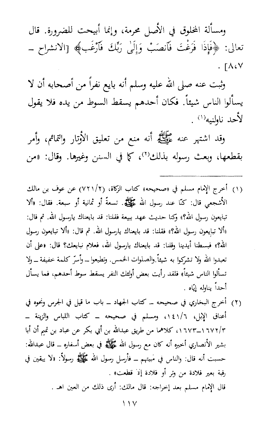 1 أخرج الإمام مسلم في "صحيحه" كتاب الزكاة 2/ 721 عن عوف بن مالك الأشجعي قال: "كنا عند رسول الله صلى الله عليه وسلم تسعة أو ثمانية أو سبعة. فقال: "ألا تبايعون رسول الله؟ " وكنا حديث عهد ببيعة، فقلنا: قد بايعناك يا رسول الله. ثم قال: "ألا تبايعون رسول الله؟ " فقلنا: قد بايعناك يا رسول الله. ثم قال: "ألا تبايعون رسول الله؟ " فبسطنا أيدينا وقلنا: قد بايعناك يا رسول الله، فعلامَ نبايعك؟ قال: "على أن تعبدوا الله ولا تشركوا به شيئاً, والصلوات الخمس، وتطيعوا –وأسرّ كلمة خفيفة- ولا تسألوا الناس شيئاً" فلقد رأيت بعض أولئك النفر يسقط سوط أحدهم، فما يسأل أحداً يناوله إياه".