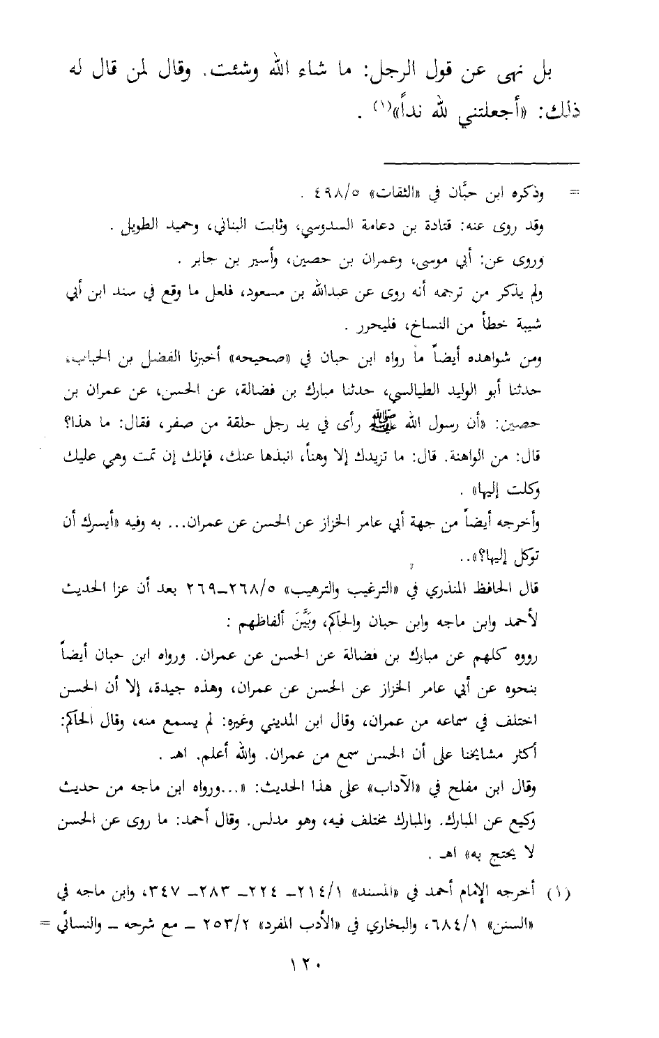 رووهم كلهم عن مبارك بن فضالة عن الحسن عن عمران. ورواه ابن حبان أيضاً بنحوه عن أبي عامر الخزاز عن الحسن عن عمران، وهذه جيدة، إلا أن الحسن اخنلف في سماعه من عمران، وقال ابن المديني وغيره: لم يسمع منه، وقال الحاكم: أكثر مشايخنا على أن الحسن سمع من عمران. والله أعلم. اهـ.