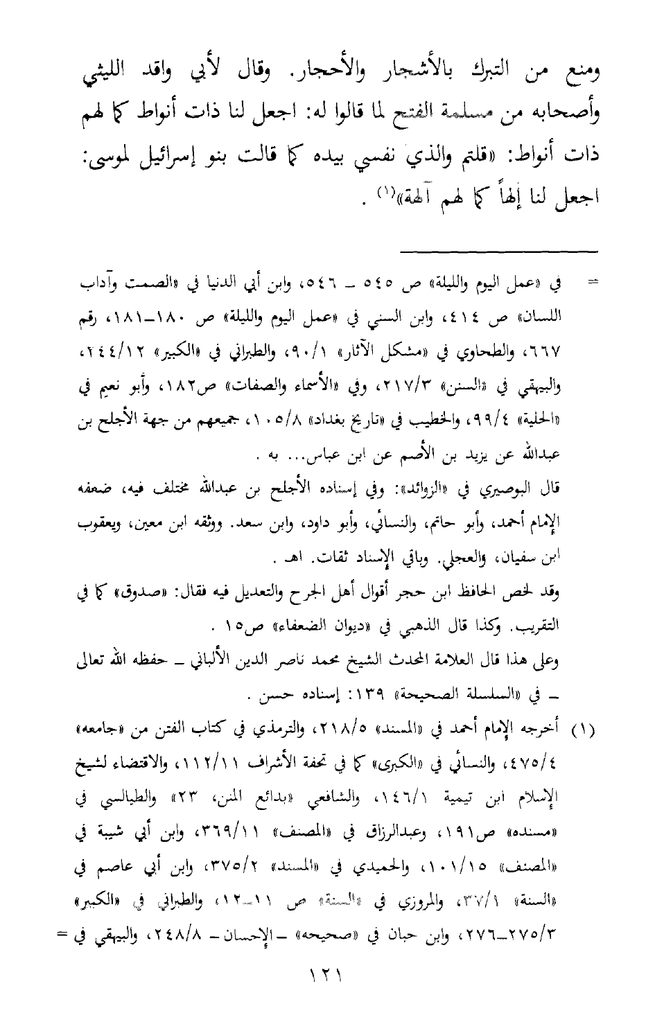 ومنع من التبرك بالأشجار والأحجار. وقال لأبي واقد الليثي وأصحابه من مسلمة الفتح لما قالوا له: اجعل لنا ذات أنواط كما لهم ذات أنواط: " قلتم والذي نفسي بيده كما قالت بنو إسرائيل لموسى {اجْعَلْ لَنَا إِلَهاً كَمَا لَهُمْ آلِهَةٌ} " 1.