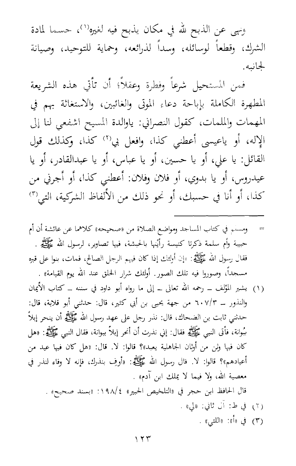 فمن المستحيل شرعاً وفطرة وعقلاً؛ أن تأتي هذه الشريعة المطهرة الكاملة بإباحة دعاء الموتى والغائبين، والاستغاثة بهم في المهمات والملمات، كقول النصراني: يا والدة المسيح اشفعي لنا إلى الإله، أو يا عيسى، أعطني كذا، وافعل بي2 كذا، وكذلك قول القائل: يا علي، أو يا حسين، أو يا عباس، أو يا عبد القادر، أو يا عيدروس، أو يا بدوي، أو فلان وفلان: أعطني كذا، أو أجرني من كذا، أو أنا في حسبك، أو نحو ذلك من الألفاظ الشركية، التي3