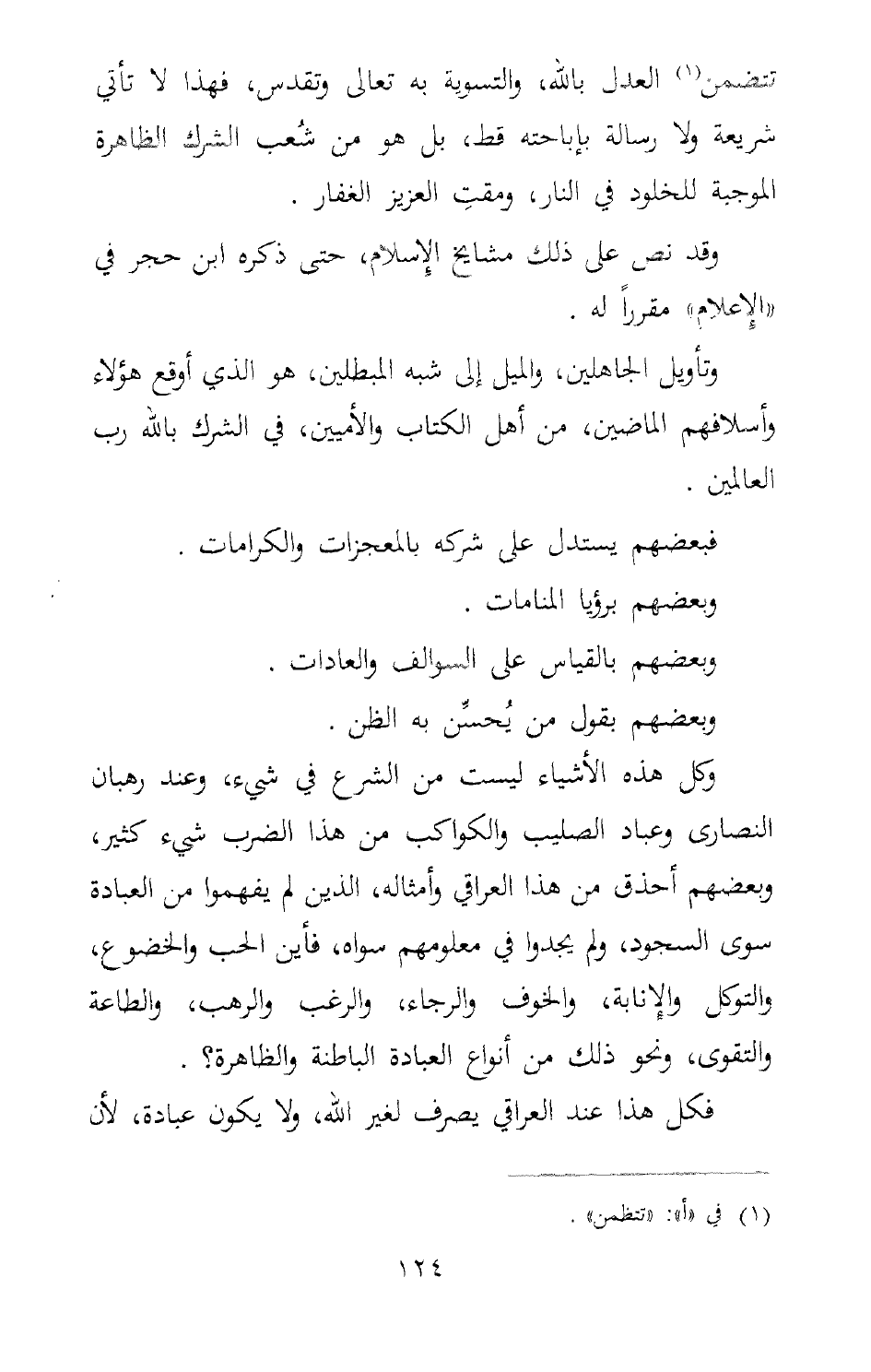 وكل هذه الأشياء ليست من الشرع في شيء، وعند رهبان النصارى وعباد الصليب والكواكب من هذا الضرب شيء كثير، وبعضهم أحذق من هذا العراقي وأمثاله، الذين لم يفهموا من العبادة سوى السجود، ولم يجدوا في معلومهم سواه، فأين الحب والخضوع، والتوكل والإنابة، والخوف والرجاء، والرغب والرهب، والطاعة والتقوى، ونحو ذلك من أنواع العبادة الباطنة والظاهرة؟ فكل هذا عند العراقي يصرف لغير الله، ولا يكون عبادة، لأن