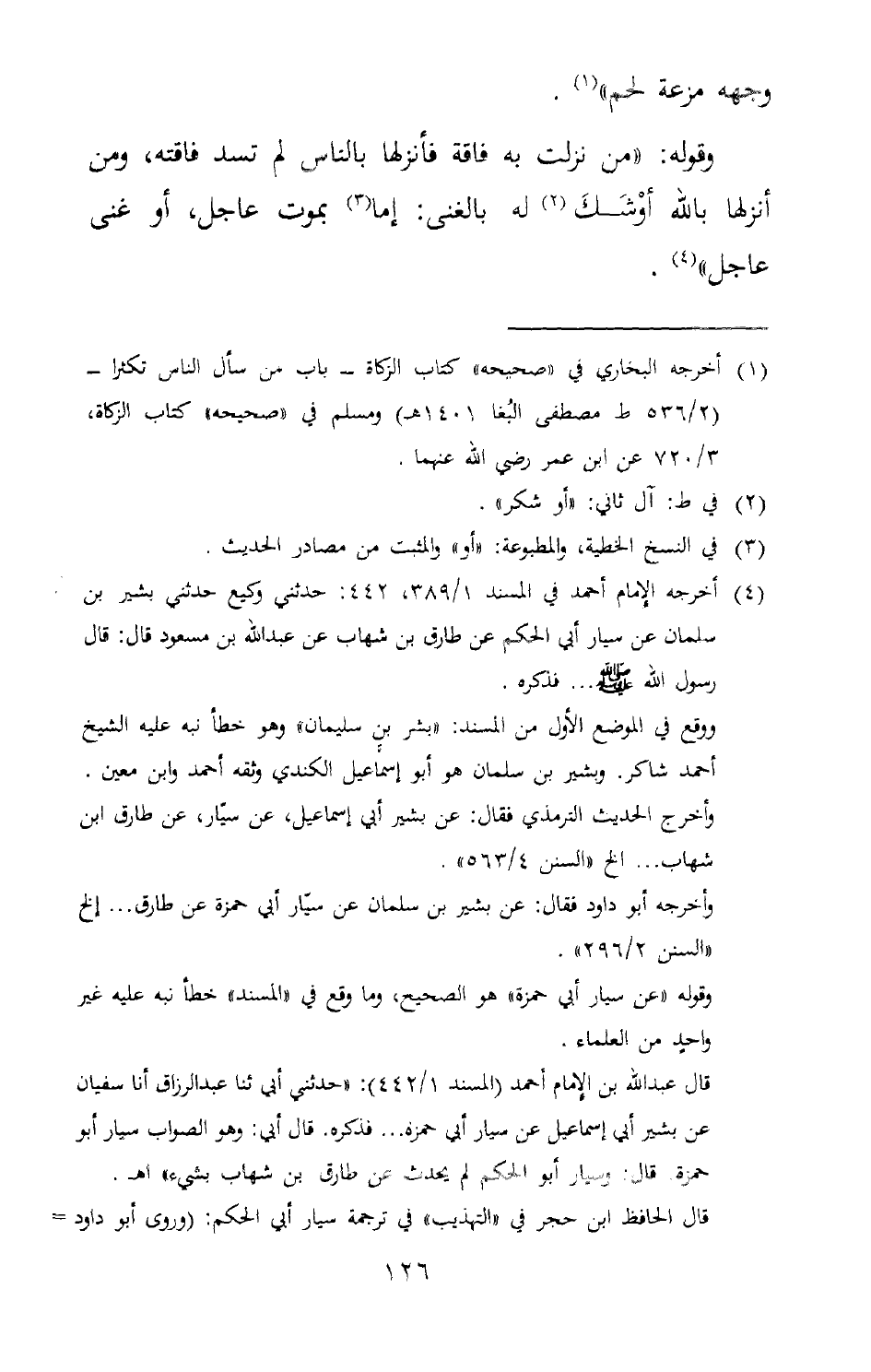 4 أخرجه الإمام أحمد في المسند 1/ 389، 442: حدثني وكيع حدثني بشير بن سلمان عن سيار أبي الحكم عن طارق بن شهاب عن عبد الله بن مسعود قال: قال رسول الله صلى الله عليه وسلم ... فذكره.