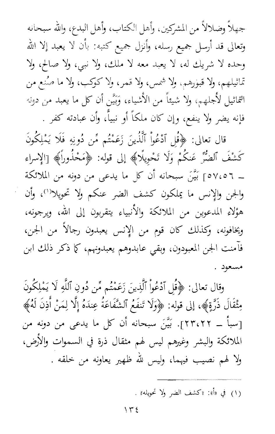 وقال تعالى: {قُلِ ادْعُوا الَّذِينَ زَعَمْتُمْ مِنْ دُونِ اللَّهِ لا يَمْلِكُونَ مِثْقَالَ ذَرَّةٍ} .إلى قوله: {وَلا تَنْفَعُ الشَّفَاعَةُ عِنْدَهُ إِلَّا لِمَنْ أَذِنَ لَهُ} . [سبأ:22-23] . بَيَّنَ سبحانه أن كل ما يدعى من دونه، من الملائكة والبشر وغيرهم ليس لهم مثقال ذرة في السموات والارض, ولا لهم نصيب فيهما, وليس لله ظهير يعاونه من خلقه.