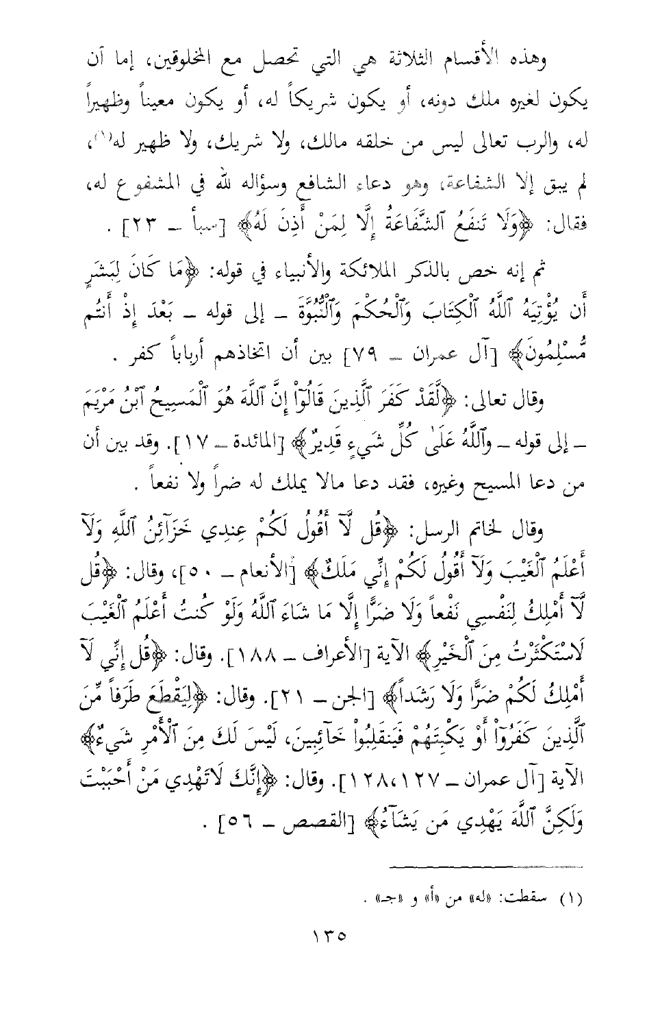 وهذه الأقسام الثلاثه هي التي تحصل مع المخلوقين, إما أن يكون لغيره ملك دونه, أو يكون شريكاً له, أو يكون معيناً وظهيراً له, والرب تعالى ليس من خلقه مالك, ولا شريك, ولا ظهير له1, لم يبق إلا الشفاعة, وهو دعاء الشافع وسؤاله لله في المشفوع له, فقال: {وَلا تَنْفَعُ الشَّفَاعَةُ عِنْدَهُ إِلَّا لِمَنْ أَذِنَ لَهُ} . [سبأ:23] .