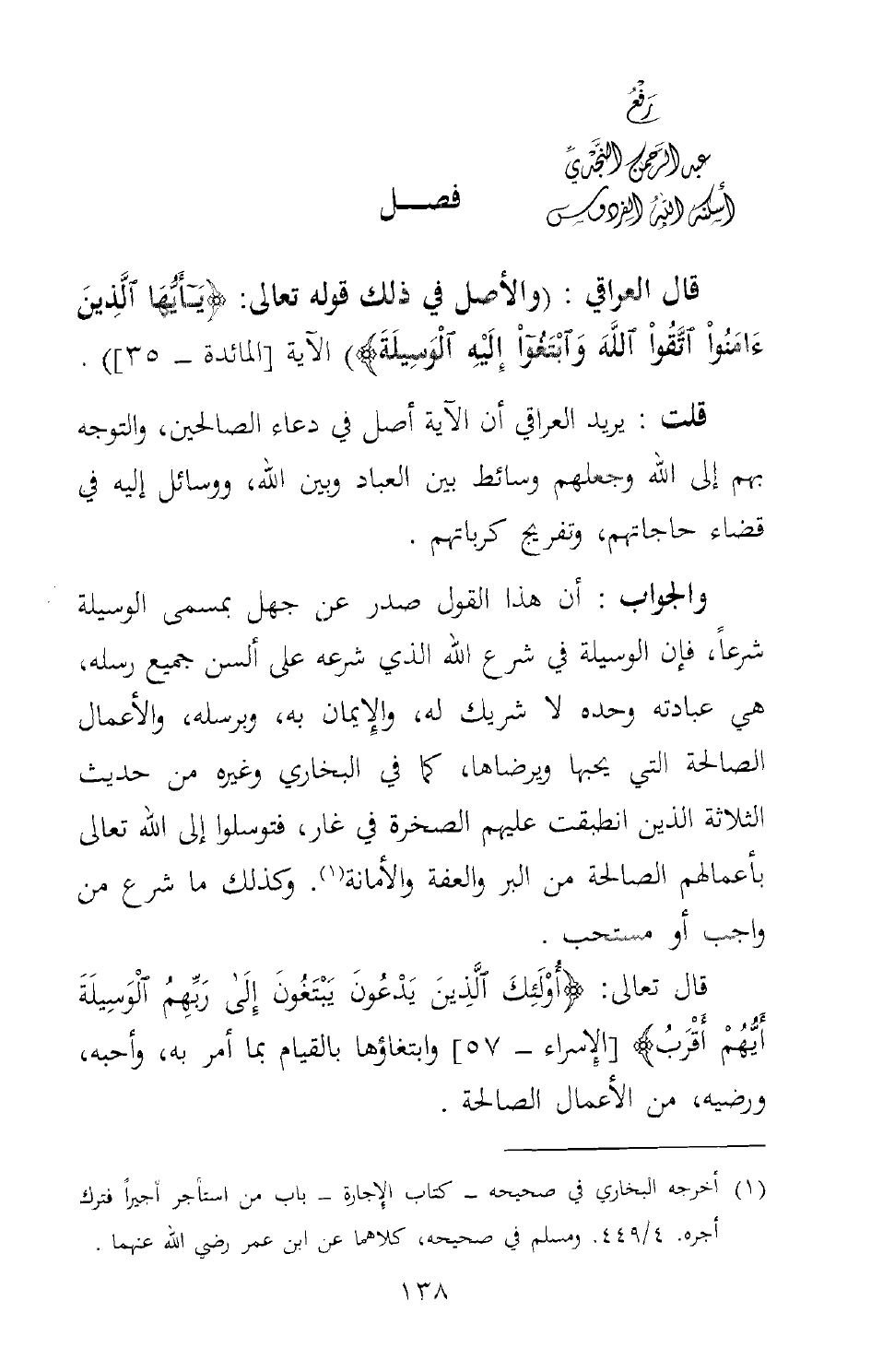 قال العراقي: "والأصل في ذلك قوله تعالى: {يَا أَيُّهَا الَّذِينَ آمَنُواْ اتَّقُواْ اللهَ وَابْتَغُواْ إِلَيهِ الْوَسِيلَةَ} . [المائدة:35] .