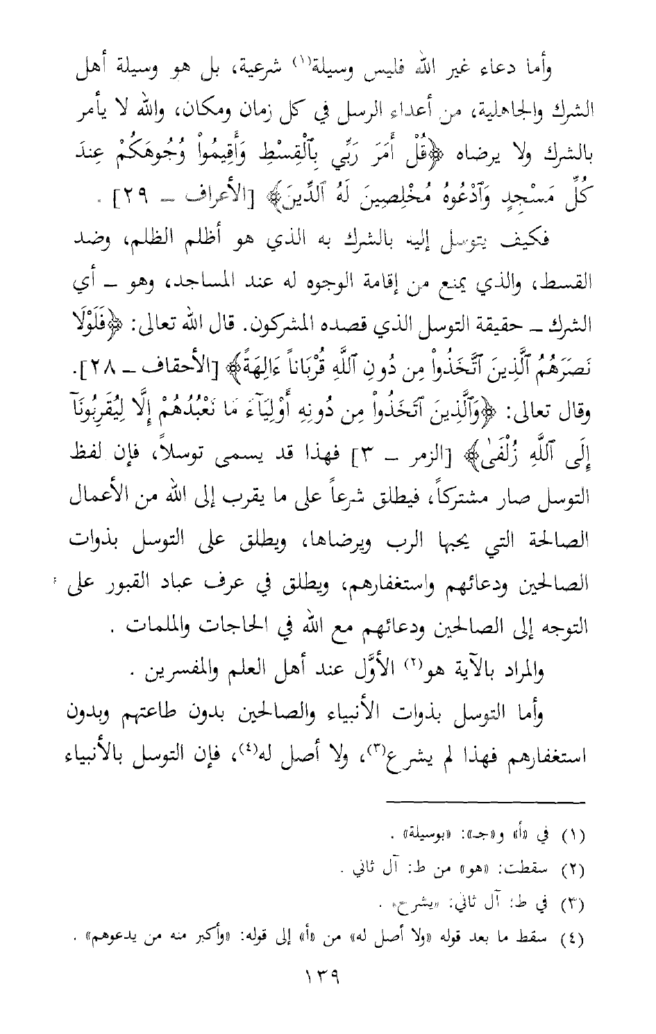 فكيف يتوسل إليه بالشرك به الذي هو أظلم الظلم، وضد القسط، والذي يمنع من إقامة الوجوه له عند المساجد، وهو –أي الشرك- حقيقة التوسل الذي قصده المشركون. قال الله تعالى: {فَلَوْلَا نَصَرَهُمُ الَّذِينَ اتَّخَذُوا مِن دُونِ اللَّهِ قُرْبَانًا آلِهَةً} . [الأحقاف:28] وقال تعالى: {وَالَّذِينَ اتَّخَذُوا مِن دُونِهِ أَوْلِيَاء مَا نَعْبُدُهُمْ إِلَّا لِيُقَرِّبُونَا إِلَى اللَّهِ زُلْفَى} . [الزمر: 3] فهذا قد يسمى توسلاً، فإن لفظ التوسل صار مشتركاً، فيطلق شرعاً على ما يقرب إلى الله من الأعمال الصالحة التي يحبها الرب ويرضاها، ويطلق على التوسل بذوات الصالحين ودعائهم واستغفارهم، ويطلق في عرف عباد القبور على التوجه إلى الصالحين ودعائهم مع الله في الحاجات والملمات.
