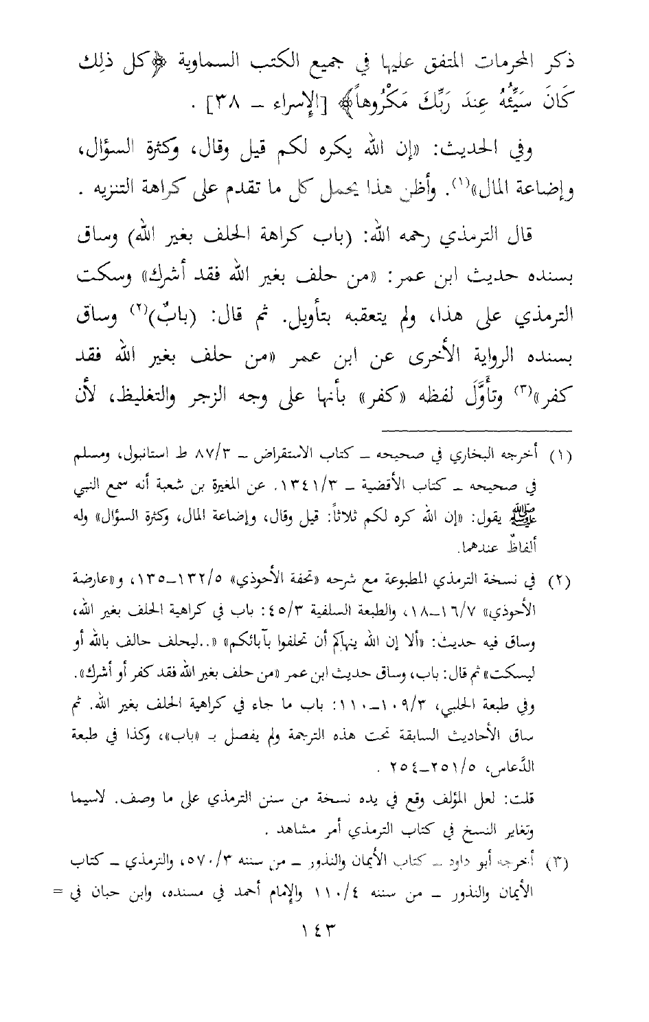 قال الترمذي رحمه الله: "باب كراهة الحلف بغير الله" وساق بسنده حديث ابن عمر: "من حلف بغير الله فقد أشرك". وسكت الترمذي علذكر المحرمات المتفق عليها في جميع الكتب السماوية {كُلُّ ذَلِكَ كَانَ سَيٍّئُهُ عِنْدَ رَبِّكَ مَكْرُوهًا} . [الإسراء:38] .