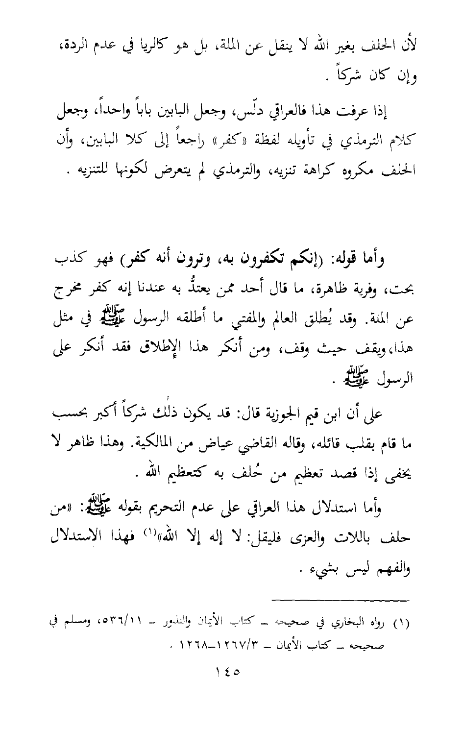 وأما استدلال هذا العراقي على عدم التحريم بقوله صلى الله عليه وسلم: "من حلف باللات والعزى فليقل: لا إله إلا الله" 1 فهذا الاستدلال والفهم ليس بشيء.