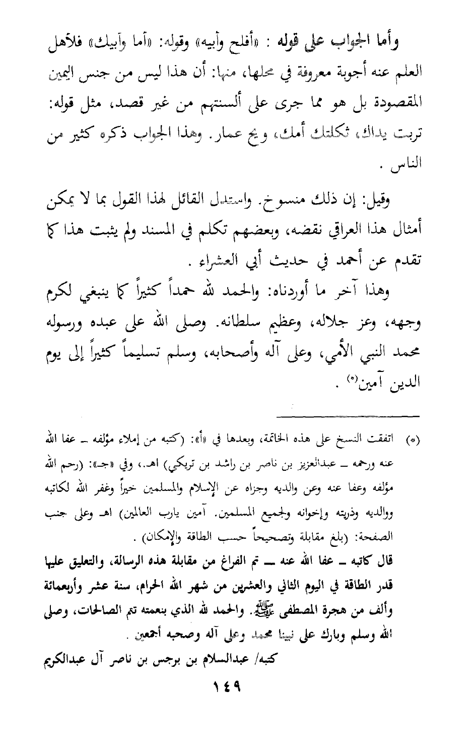 قال كاتبه –عفا الله عنه- تم الفراغ من مقابلة هذه الرسالة، والتعليق عليها قدر الطافة في اليوم الثاني والعشرين من شهر الله الحرام، سنة عشر وأربعمائة وألف من هجرة المصطفى صلى الله عليه وسلم. والحمد لله الذي بنعمته تتم الصالحات، وصلى الله وسلم وبارك على نبينا محمد وعلى آله وصحبه أجمعين.
