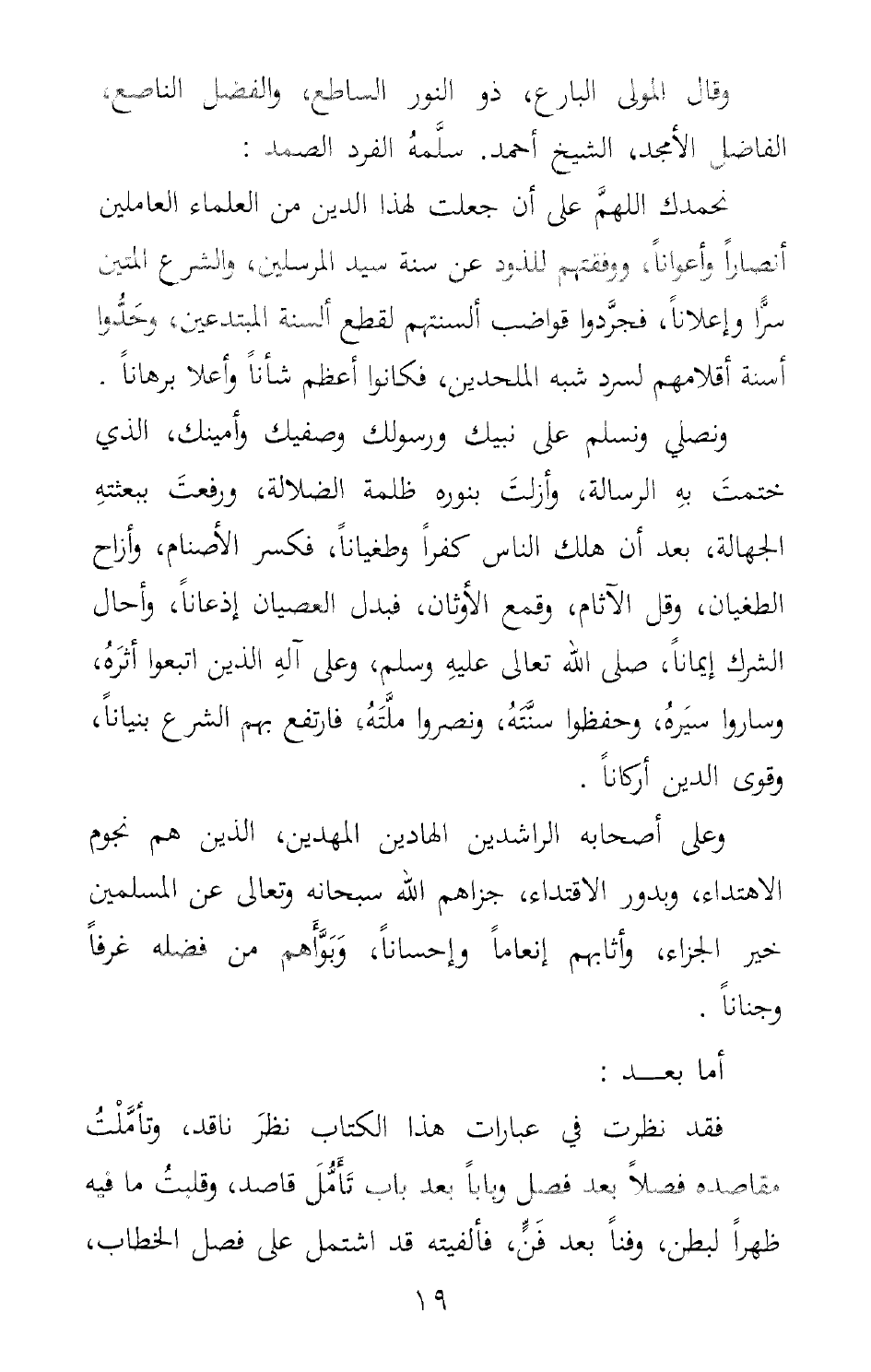 نحمدك اللهمَّ على أن جعلت لهذا الدين من العلماء العاملين أنصاراً وأعواناً، ووفقتهم للذود عن سنة سيد المرسلين، والشرع المتين سرًّا وإعلاناً، فجرَّدوا قواضب ألسنتهم لقطع ألسنة المبتدعين، وحَدُّوا أسنة أقلامهم لسرد شبه الملحدين، فكانوا أعظم شأناً وأعلى برهاناً.