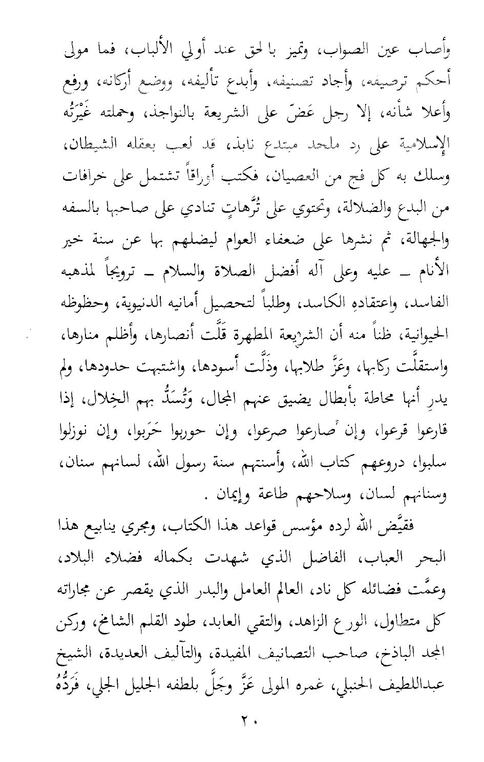 فقيّض الله لردّه مؤسس هذا الكتاب، ومجري ينابيع هذا البحر العباب، والفاضل الذي شهدت بكماله فضلاء البلاد، وعمَّت فضائله كل ناد، العالم العامل البدر الذي يقصر عن مجاراته كل متطاول، الورع الزاهد، والتقي العابد، وطود القلم الشامخ، وركن المجد الباذخ، صاحب التصانيف المفيدة، والتآليف العديدة، الشيخ عبد اللطيف الحنبلي، غمره المولى عَزَّ وَجَلَّ بلطفه الجليل الجلي، فَرَدُّهُ