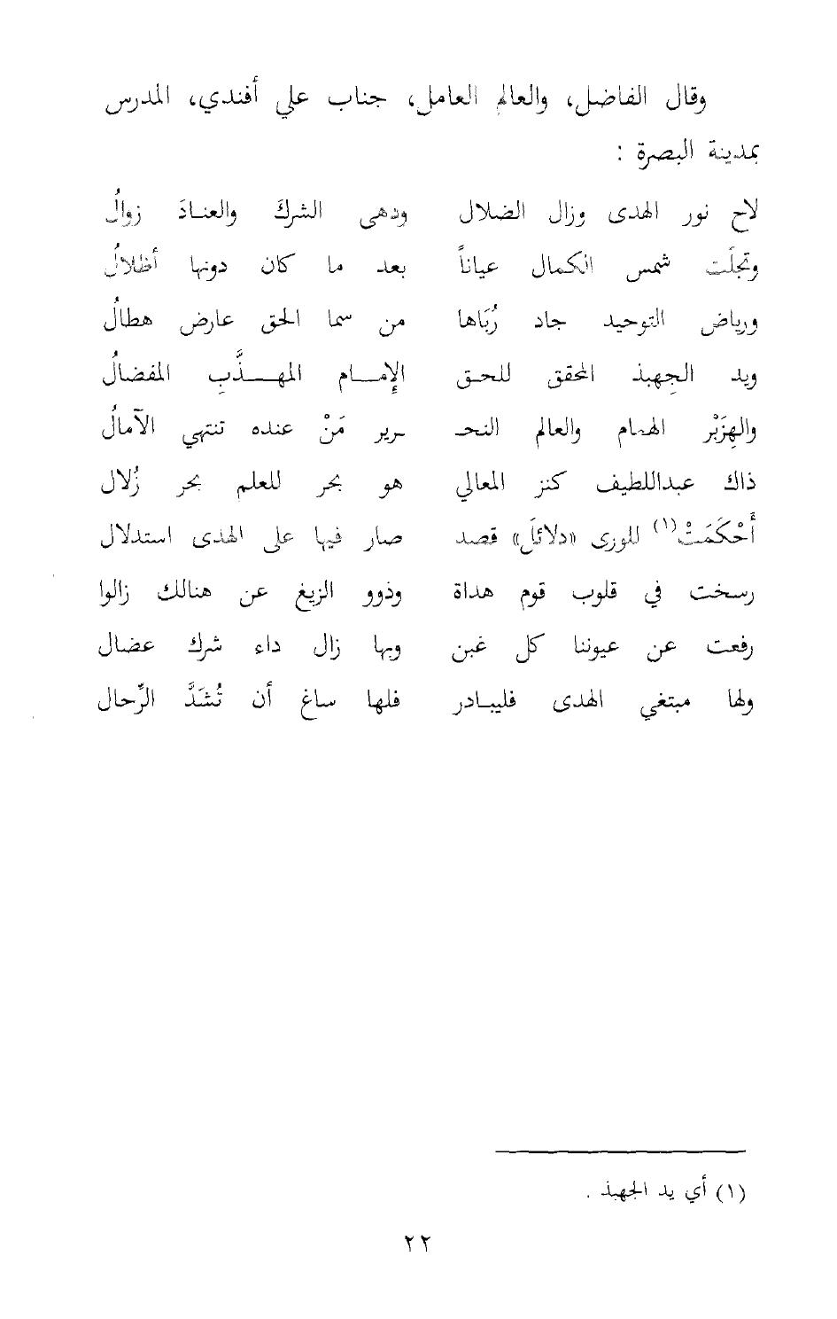 وقال الفاضل، والعالم العامل، جناب علي أفندي، المدرس بمدينة البصرة: