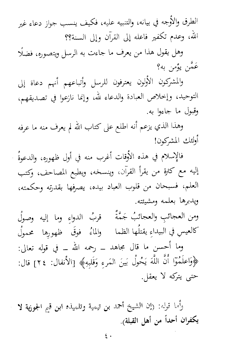 الطرق والأوجه في بيانه، والتنبيه عليه، فكيف ينسب جواز دعاء غير الله، وعدم تكفير فاعله إلى القرآن وإلى السنة؟؟