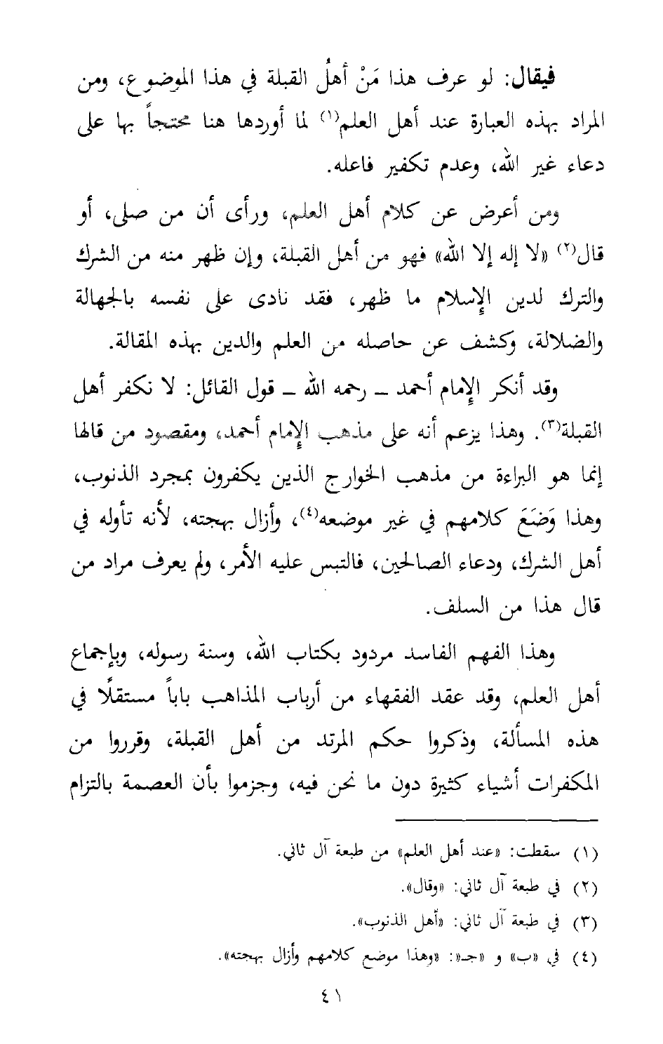 وقد أنكر الإمام أحمد –رحمه الله-قول القائل: لا نكفر أهل القبلة3.وهذا يزعم أنه على مذهب الإمام أحمد، ومقصود من قالها إنما هو البراءة من مذهب الخوارج الذين يكفرون بمجرد الذنوب، وهذا وَضَعَ كلامهم في غير موضعه4، وأزال بهجته، لأنه تأوله في أهل الشرك، ودعاء الصالحين، فالتبس عليه الأمر، ولم يعرف مراد من قال هذا من السلف.