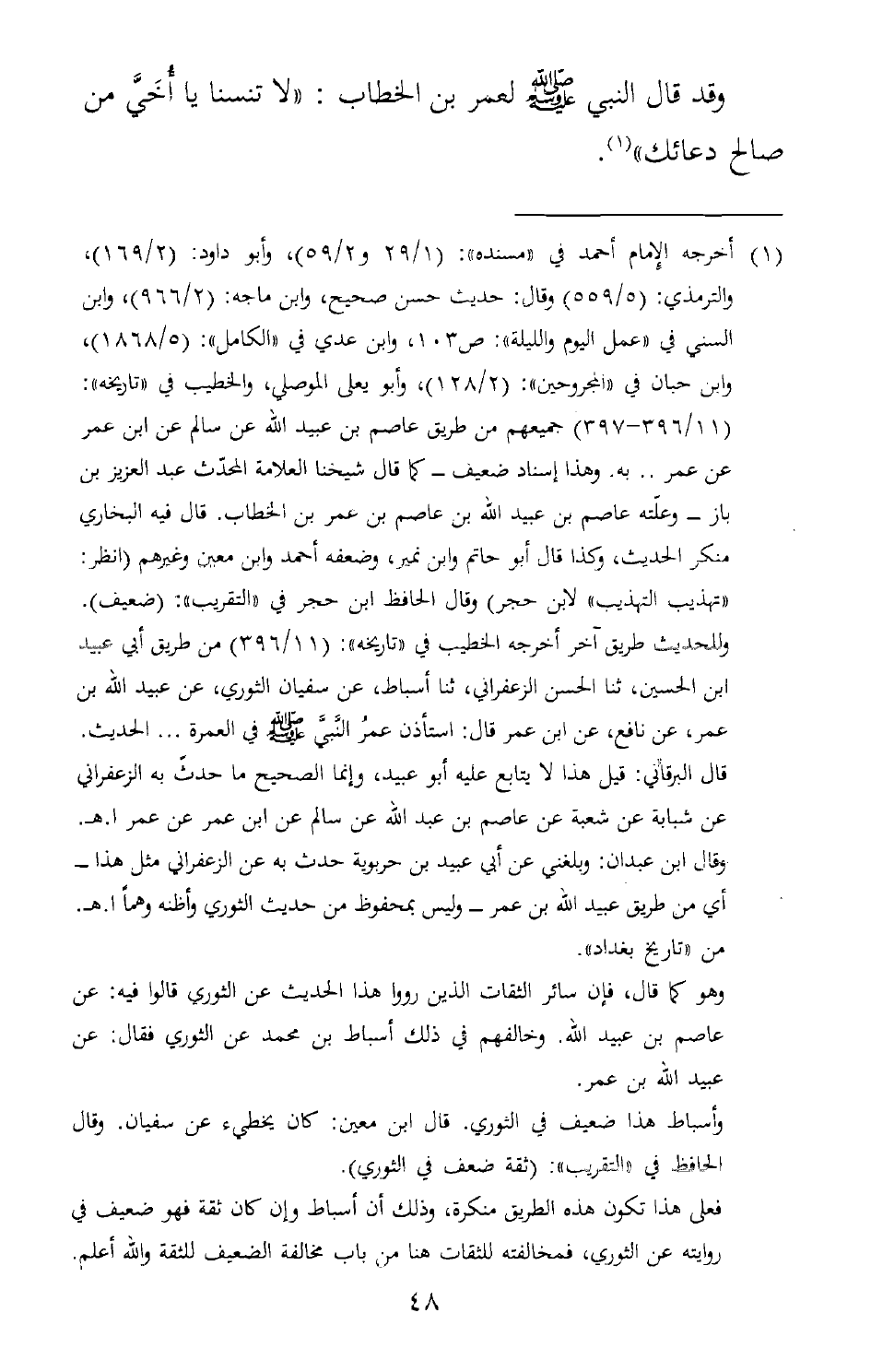 1 أخرجه الإمام أحمد في "مسنده": (1/ 29، و2/ 59) ، وأبو داود: (2/ 169) ، والترمذي: (5/ 559) وقال: حديث حسن صحيح، وابن ماجه: (2/ 966) ، وابن السني في "عمل اليوم والليلة":ص 103، وابن عدي في "الكامل": (5/ 1868) ، وابن حبان في "المجروحين": (2/ 128) ، وأبو يعلى الموصلي، والخطيب في "تاريخه": (11/ 396-397) جميعهم من طريق عاصم بن عبيد الله عن سالم عن ابن عمر عن عمر ... به. وهذا إسناد ضعيف –كما قال شيخنا العلامة المحدّث عبد العزيز بن باز-وعلّته عاصم بن عبيد الله بن عاصم بن عمر بن الخطاب. قال فيه البخاري: منكر الحديث، وكذا قال أبو حاتم وابن نمير، وضعفه أحمد وابن معين وغيرهم (انظر:"تهذيب التهذيب"لابن حجر) وقال الحافظ ابن حجر في "التقريب": (ضعيف) .