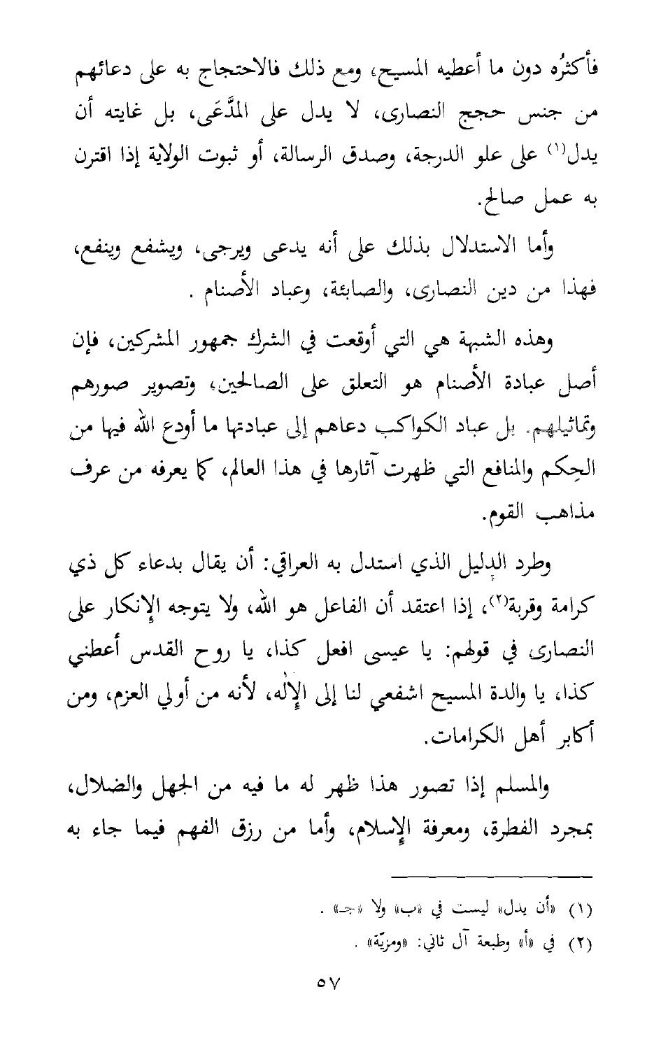 وطرد الدليل الذي استدل به العراقي: أن يقال بدعاء كل ذي كرامة وقربة2، إذا اعتقد أن الفاعل هو الله، ولا يتوجه الإنكار على النصارى في قولهم: يا عيسى افعل كذا، يا روح القدس أعطني كذا، ويا والدة المسيح اشفعي لنا إلى الإله، لأنه من أولي العزم، ومن أكابر أهل الكرامات.
