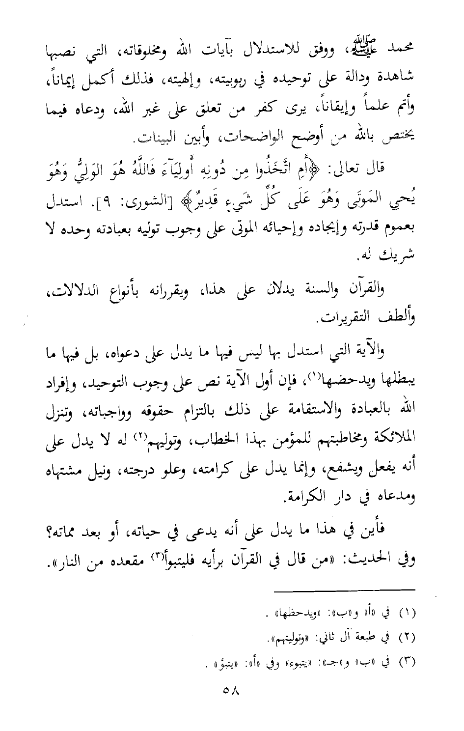 محمد صلى الله عليه وسلم، ووفق للاستدلال بآيات الله ومخلوقاته، التي نصبها شاهدة ودالة على توحيده في ربوبيته، فذلك أكمل إيماناً، وأتم علماً وإيقاناً، يرى كفر من تعلق على غير الله، ودعاه فيما يختص بالله من أوضح الواضحات، وأبين البينات.