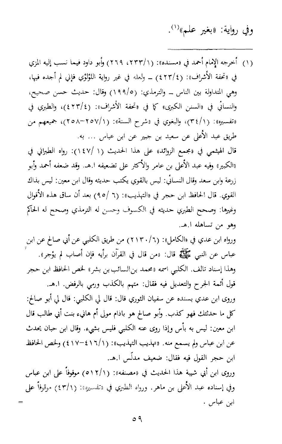 1 أخرجه الإمام أحمد في "مسنده": (1/ 233، 269) ، وأبو داود فيما نسب إليه المزي في "تحفة الأشراف": (4/ 423) –ولعله في غير رواية اللؤلؤي فإني لم أجده فيها، وهي المتداولة بين الناس- والترمذي: (5/ 199) وقال: حديث حسن صحيح، والنسائي في "السنن الكبرى" كما في "تحفة الأشراف": (4/ 423) ، والطبري في "تفسيره": (1/34) ، والبغوي في "شرح السنة": (1/ 257-258) ، جميعهم من طريق عبد الأعلى عن سعيد بن جبير عن ابن عباس ... به.