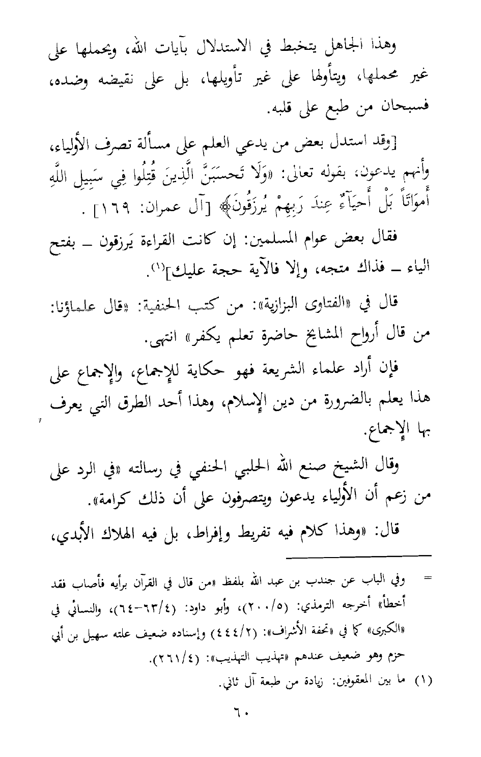 [وقد استدل بعض من يدعي العلم على مسألة تصرف الأولياء، وأنهم يدعون، بقوله تعالى: {وَلاَ تَحْسَبَنَّ الَّذِينَ قُتِلُواْ فِي سَبِيلِ اللهِ أَمْوَاتًا بَلْ أَحْيَاء عِندَ رَبِّهِمْ يُرْزَقُونَ} . [آل عمران:169] .