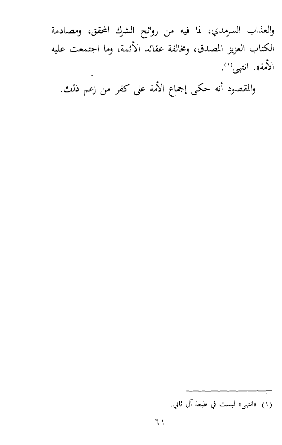 والعذاب السرمدي، لما فيه من روائج الشرك المحقق، ومصادمة الكتاب العزيز المصدق، ومخالفة عقائد الأئمة، وما اجتمعت عليه الأمة". انتهى1.