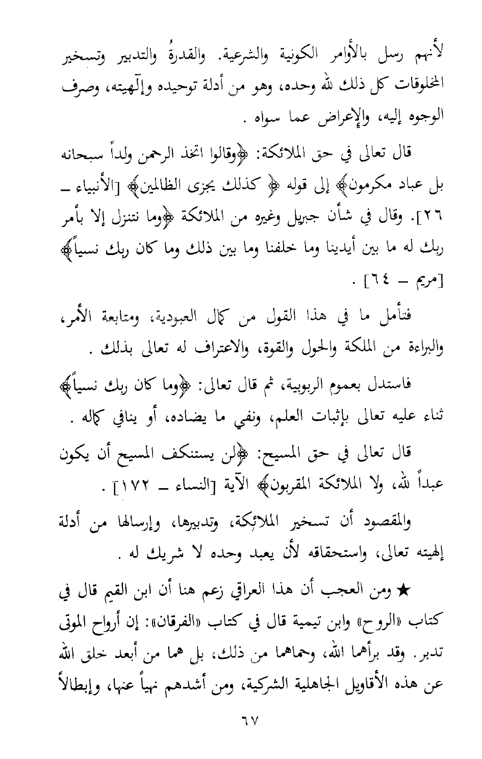 قال تعالى في حق الملائكة: {وَقَالُوا اتَّخَذَ الرَّحْمَنُ وَلَدًا سُبْحَانَهُ بَلْ عِبَادٌ مُّكْرَمُونَ} . إلى قوله {كَذَلِكَ نَجْزِي الظَّالِمِينَ} . [الأنبياء:26-29] . وقال في شأن جبريل وغيره من الملائكة {وَمَا نَتَنَزَّلُ إِلَّا بِأَمْرِ رَبِّكَ لَهُ مَا بَيْنَ أَيْدِينَا وَمَا خَلْفَنَا وَمَا بَيْنَ ذَلِكَ وَمَا كَانَ رَبُّكَ نَسِيًّا} . [مريم:64] .