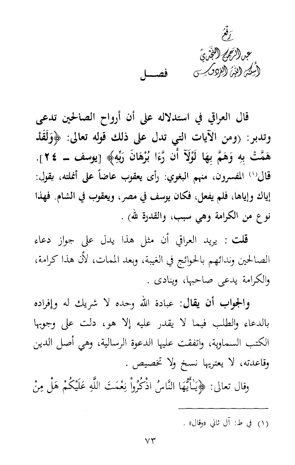 قال العراقي في استدلاله على أن أرواح الصالحين تدعى وتدبر: (ومن الآيات التي تدل على ذلك قوله تعالى: {وَلَقَدْ هَمَّتْ بِهِ وَهَمَّ بِهَا لَوْلا أَن رَّأَى بُرْهَانَ رَبِّهِ} . [يوسف:24] . قال1 المفسرون، منهم البغوي: رأى يعقوب عاضاً على أنملته، يقول: إياك وإياها، فلم يفعل، فكان يوسف في مصر، ويعقوب في الشام. فهذا نوع من الكرامة وهي سبب، والقدرة لله) .