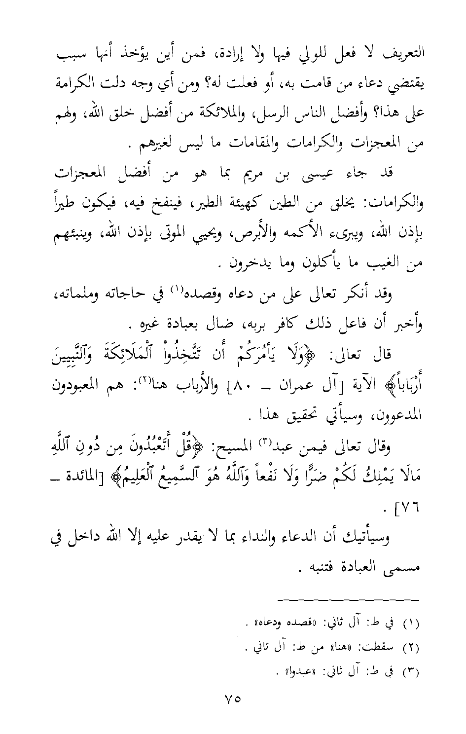 التعريف لا فعل للولي فيها ولا إرادة، فمن أين يؤخذ أنها سبب يقتضي دعاء من قامت به، أو فعلت له؟ ومن أي وجه دلت الكرامة على هذا؟ وأفضل الناس الرسل، والملائكة من أفضل خلق الله، ولهم من المعجزات والكرامات والمقامات ما ليس لغيرهم.
