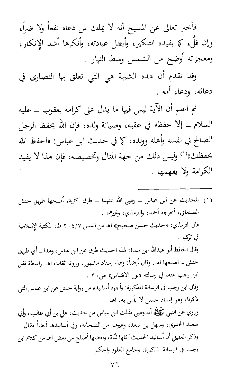 ثم اعلم أن الآية ليس فيها ما يدل على كرامة يعقوب –عليه السلام- إلا حفظه في عقبه، وصيانة ولده، فإن الله يحفظ الرجل الصالح في نفسه وأهله ووله، كما في حديث ابن عباس: "احفظ الله يحفظك"1. وليس ذلك من جهة المثال وتخصيصه، فإن هذا لا يفيد الكرامة ولا يفهمها.