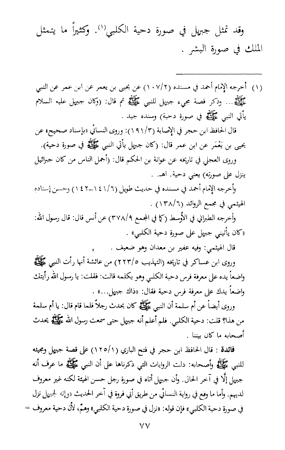 1 أخرجه أحمد في مسنده (2/ 107) عن يحيى بن يعمر عن ابن عمر عن النبي صلى الله عليه وسلم ... وذكر قصة مجيء جبريل للنبي صلى الله عليه وسلم ثم قال: "وكان جبريل عليه السلام يأتي النبي صلى الله عليه وسلم في صورة دحية". وسنده جيد.