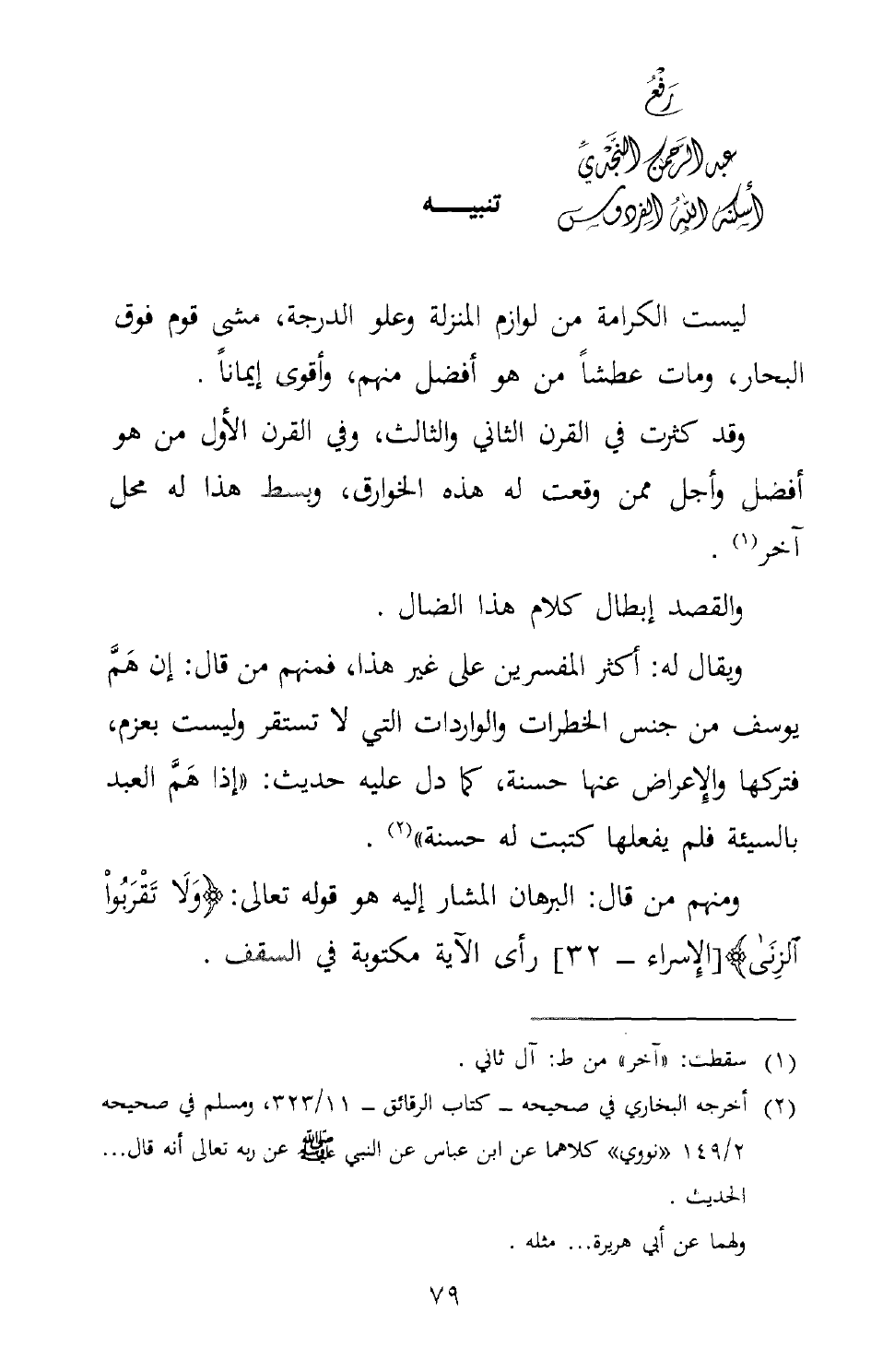 ليست الكرامة من لوازم المنزلة وعلو الدرجة، مشى قوم فوق البحار، ومات عطشاً من هو أفضل منهم، وأقوى إيماناً.