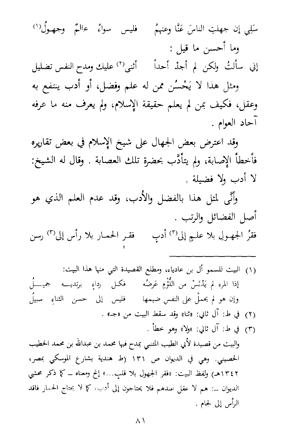 ومثل هذا لا يَحسُنُ ممن له علم وفضل، أو أدب ينتفع به وعقل، فكيف بمن لم يعلم حقيقة الإسلام، ولم يعرف منه ما عرفه آحاد العوام.