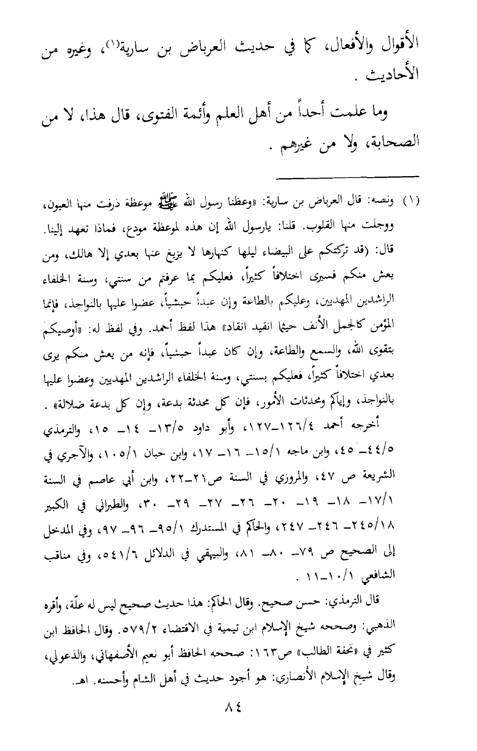 1 ونصه: قال العرباض بن سارية: "وعظنا رسول الله صلى الله عليه وسلم موعظة ذرفت منها العيون، ووجلت منها القلوب. قلنا: يا رسول الله، إن هذه لموعظة مودع، فماذا تعهد إلينا؟ قال: "وقد تركتكم على البيضاء ليلها كنهارها لا يزيغ عنها بعدي إلا هالك، ومن يعش منكم فسيرى اختلافاً كثيراً، فعليكم بما عرفتم من سنتي، وسنة الخلفاء الراشدين المهديين، وعليكم بالطاعة وإن عبداً حبشياً، عضوا عليها بالنواجذ، فإنما المؤمن كالجمل الأنف حيثما انقيد انقاد". هذا لفظ أحمد. وفي لفظ له: "أوصيكم بتقوى الله، والسمع والطاعة، وإن كان عبداً حبشياً، فإنه من يعش منكم يرى بعدي اختلافاً كثيراً، فعليكم بسنتي، وسنة الخلفاء الراشدين المهديين، وعضوا عليها بالنواجذ، وإياكم ومحدثات الأمور، فإن كل محدثة بدعة، وإن كل بدعة ضلالة". أخرجه أحمد 4/ 126-127، وأبو داود 5/ 13-14-15، والترمذي 5/ 44-45، وابن ماجه 1/ 15-16-17، وابن حبان 1/ 105، والآجري في الشريعة ص 47، والمروزي في السنة ص21-22، وابن أبي عاصم في السنة 1/ 17-18-19-20-26-27-29-30، والطبراني في الكبير 18/ 245- 246- 247، والحاكم في المستدرك 1/ 95-96-97، وفي المدخل إلى الصحيح ص79-80-81، والبيهقي في الدلائل 6/ 541، وفي مناقب الشافعي 1/ 10-11.