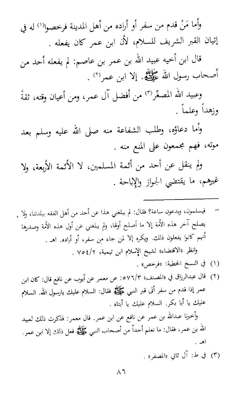 وأما مَنْ قدم من سفر أو أراده من أهل المدينة فرخصوا1 له في إتيان القبر الشريف للسلام، لأن ابن عمر كان يفعله.