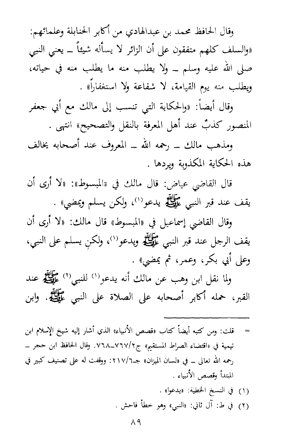 وقال الحافظ محمد بن عبد الهادي من أكابر الحنابلة وعلمائهم: "والسلف كلهم متفقون على أن الزائر لا يسأله شيئاً –يعني النبي صلى الله عليه وسلم- ولا يطلب منه ما يطلب منه في حياته، ويطلب منه يوم القيامة، لا شفاعة ولا استغفاراًَ".