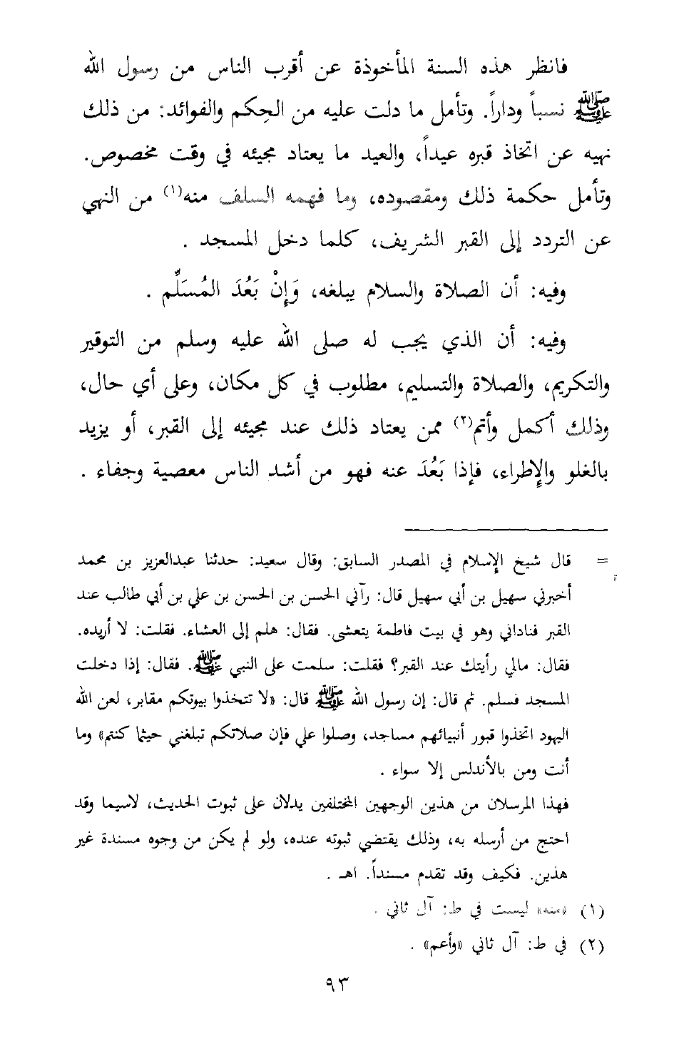 فانظر هذه السنة المأخوذة عن أقرب الناس من رسول الله صلى الله عليه وسلم نسباً وداراًَ. وتأمل ما دلت عليه من الحِكم والفوائد: من ذلك نهيه عن اتخاذ قبره عيداً، والعيد ما يعتاد مجيئه في وقت مخصوص. وتأمل حكمة ذلك ومقصوده، وما فهمه السلف منه1 من النهي عن التردد إلى القبر الشريف، كلما دخل المسجد.