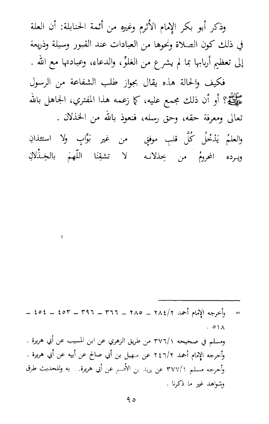وذكر أبو بكر الإمام الأثرم وغيره من أئمة الحنابلة: أن العلة في ذلك كون الصلاة ونحوها من العبادات عند القبور وسيلة وذريعة إلى تعظيم أربابها بما لم يشرع من الغلوِّ، والدعاء، وعبادتها مع الله.