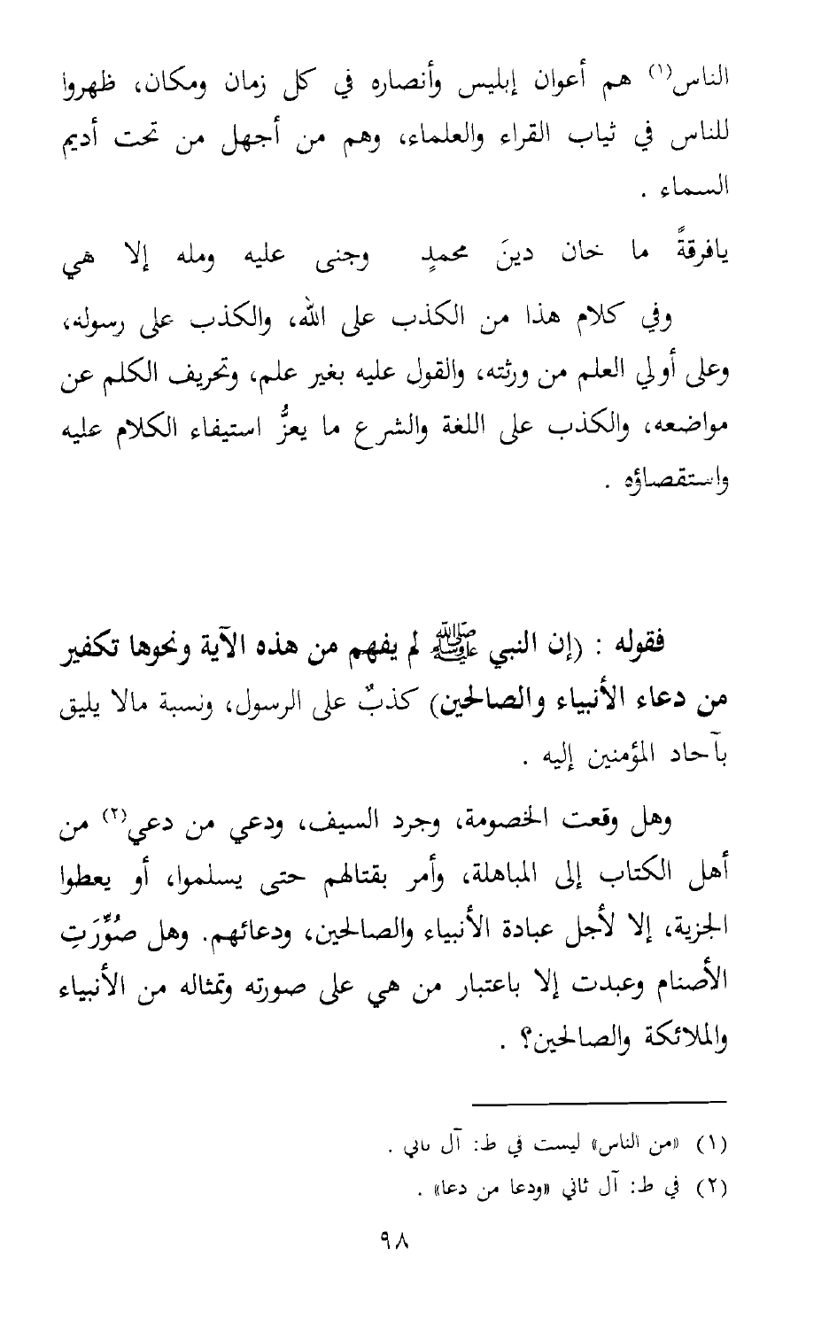 وهل وقعت الخصومة، وجرد السيف، ودعي من دعي2 من أهل الكتاب إلى المباهلة، وأمر بقتالهم حتى يسلموا، أو يعطوا الجزية، إلا لأجل عبادة الأنبياء والصالحين، ودعائهم. وهل صُوِّرَتِ الأصنام وعبدت إلا باعتبار من هي على صورته وتمثاله من الأنبياء والملائكة والصالحين؟