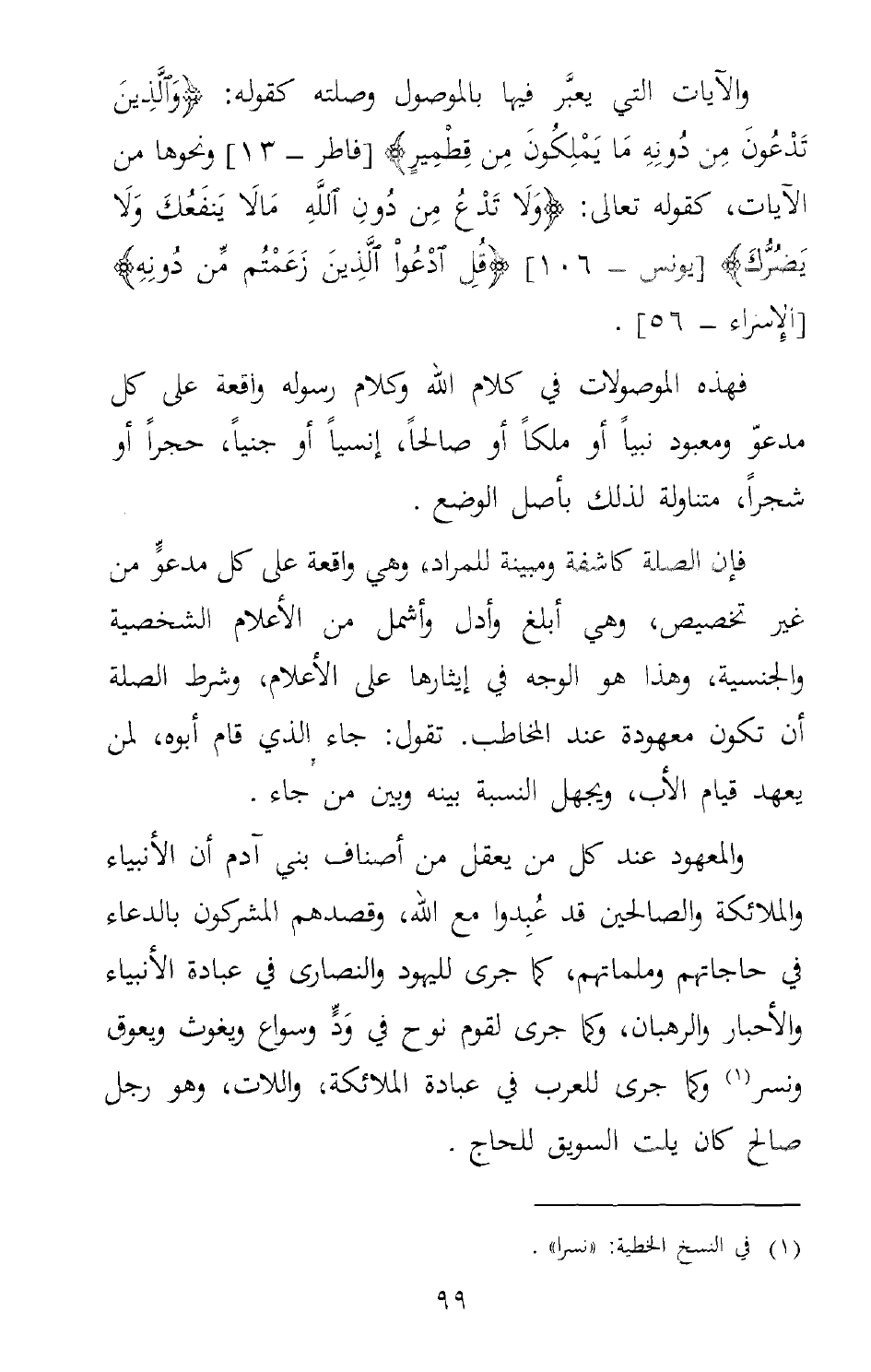 فهذه الموصولات في كلام الله وكلام رسوله واقعة على كل مدعوّ ومعبود نبياً كان أو ملكاً أو صالحاًَ، إنسياً أو جنياً، حجراً أو شجراً، متناولة لذلك بأصل الوضع.