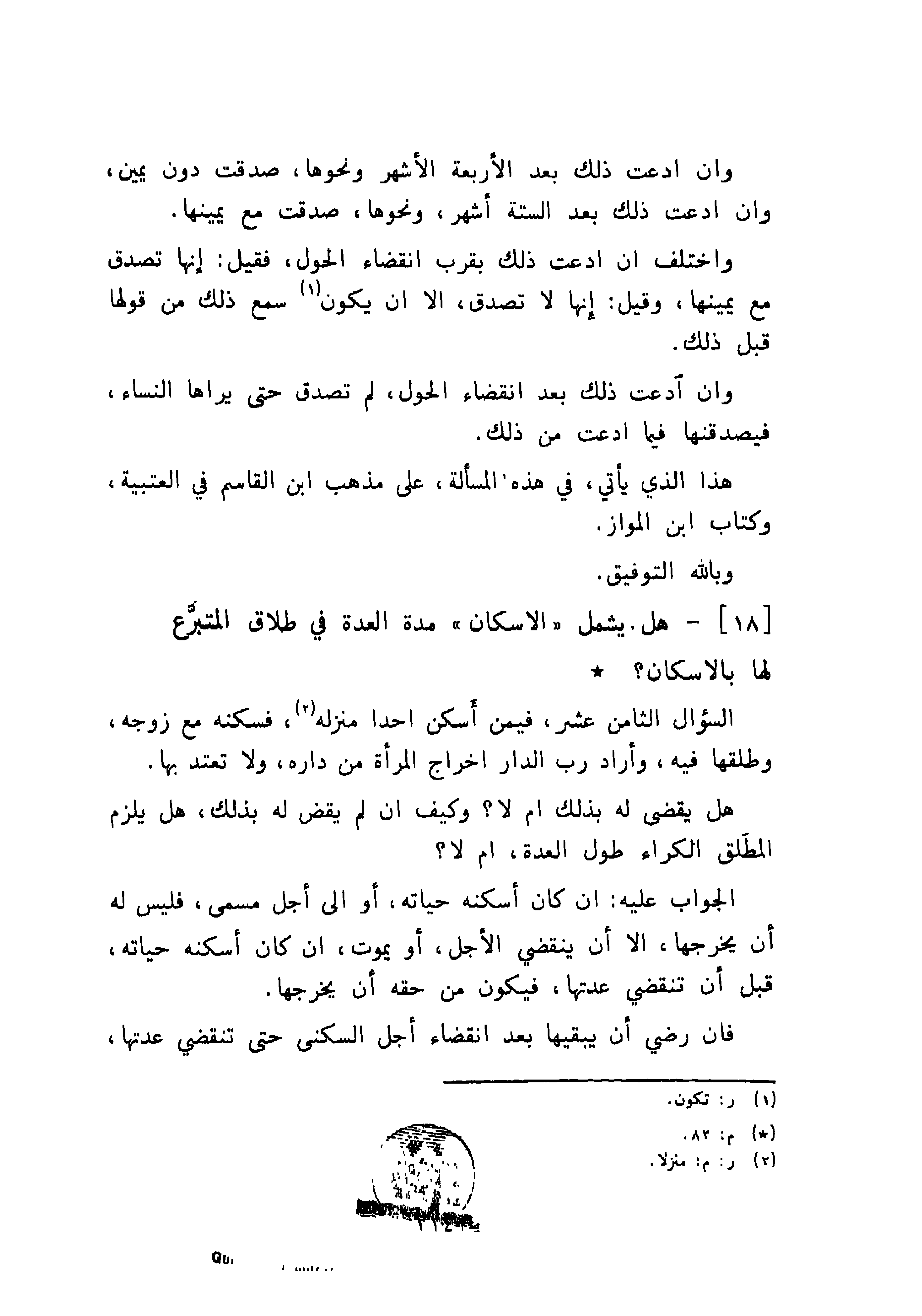 السؤال الثامن عشر، فيمن أسكن أحدا منزله، فسكنه مع زوجه، وطلقها فيه، وأراد رب الدار إخراج المرأة من داره، ولا تعتد بها.