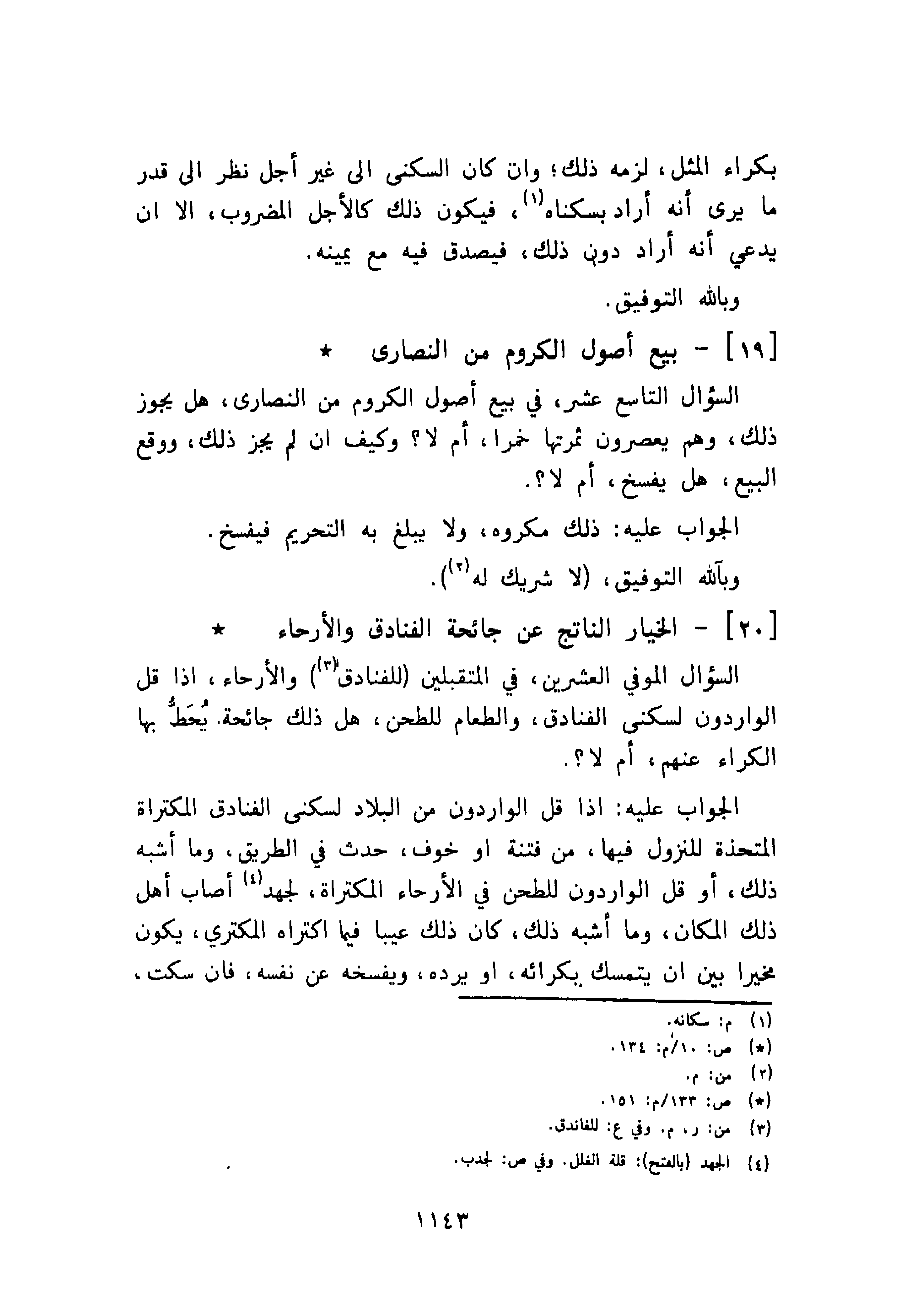 السؤال الموفي العشرين، في المتقبلين للفنادق والأرحاء، إذا قل الواردون لسكنى الفنادق، والطعام للطحن، هل ذلك جائحة يُحَطُّ بها الكراء عنهم، أم لا؟.