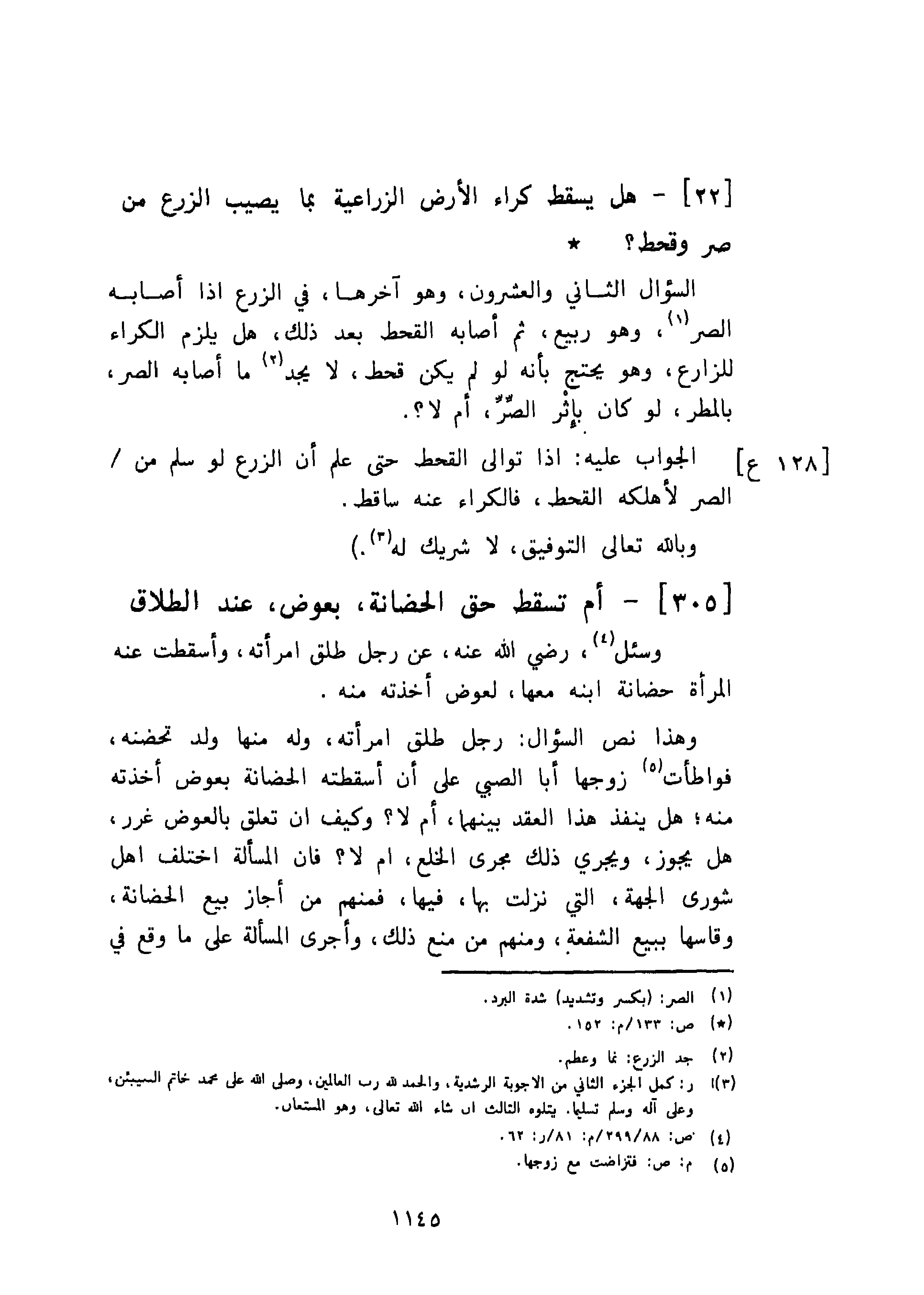 وهذا نص السؤال: رجل طلق امرأته، وله منها ولد تحضنه، فواطأت زوجها أبا الصبي على أن أسقطته الحضانة بعوض أخذته منه؛ هل ينفذ هذا العقد بينهما، أم لا؟ وكيف إن تعلق بالعوض غرر، هل يجوز، ويجري ذلك مجرى الخلع، أم لا؟ فإن المسألة اختلف أهل شورى الجهة، التي نزلت بها، فيها، فمنهم من أجاز بيع الحضانة، وقاسها ببيع الشفعة، ومنهم من منع ذلك، وأجرى المسألة على ما وقع في