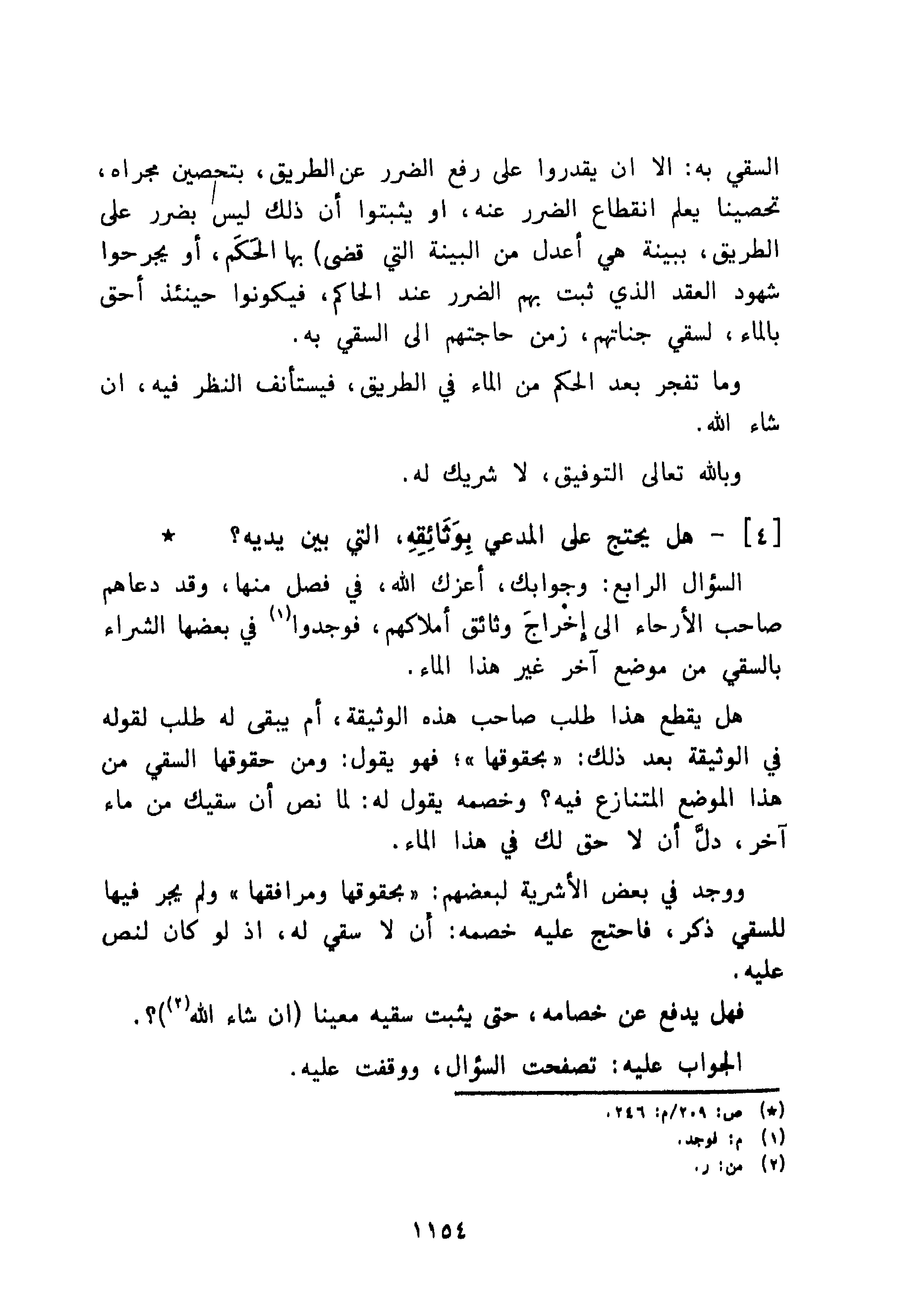 هل يقطع هذا طلب صاحب هذه الوثيقة، أم يبقى له طلب لقوله في الوثيقة بعد ذلك: " بحقوقها "؛ فهو يقول: ومن حقوقها السقي من هذا الموضع المتنازع فيه؟ وخصمه يقول له: لما نص أن سقيك من ماء آخر، دلَّ أن لا حق لك في هذا الماء.