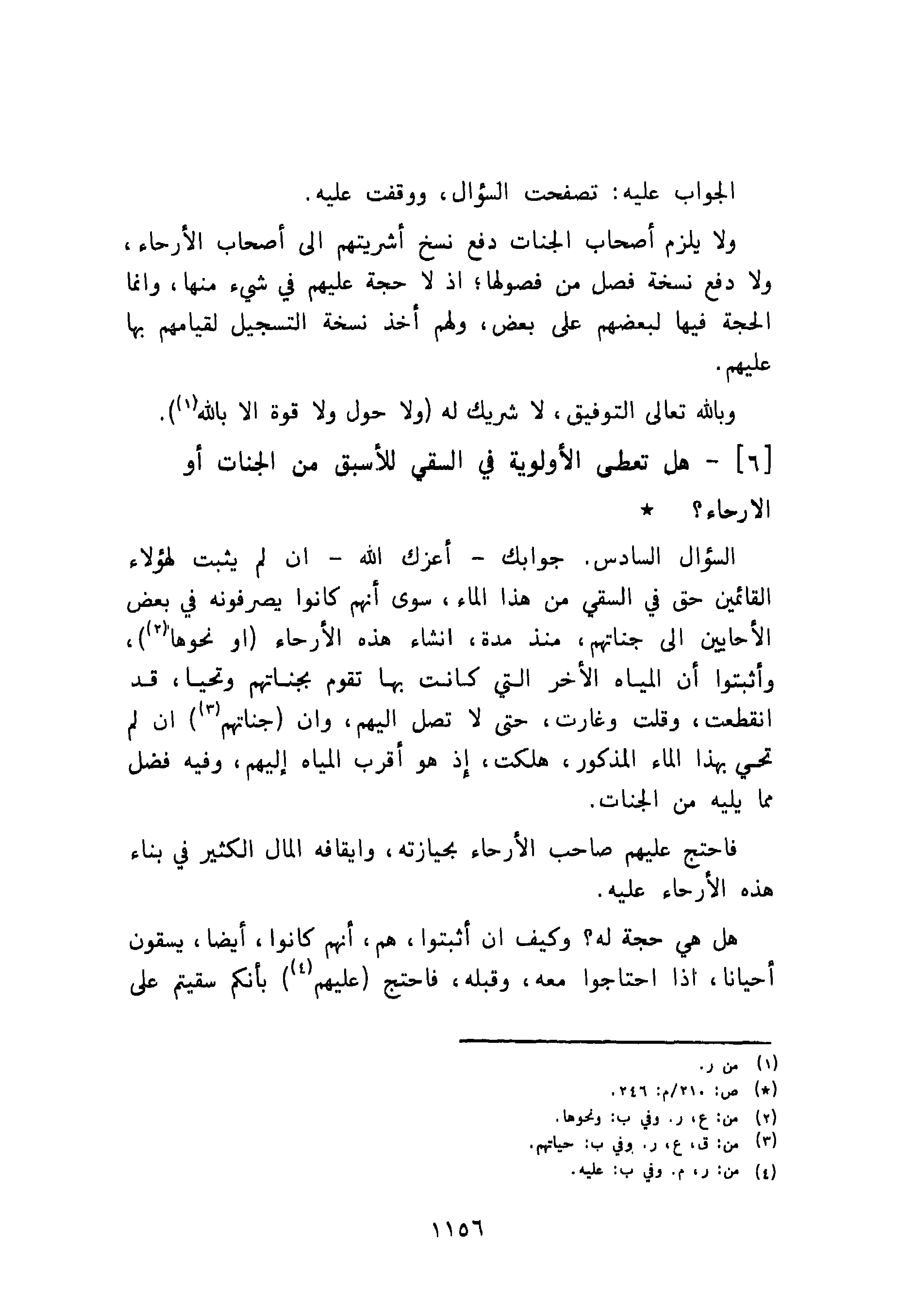 السؤال السادس. جوابك - أعزك الله - إن لم يثبت لهؤلاء القائمين حق في السقي من هذا الماء، سوى أنهم كانوا يصرفونه في بعض الأحايين إلىجناتهم منذ مدة، إنشاء هذه الأرحاء أو نحوها، وأثبتوا أن المياه الأخر التي كانت بها تقوم بجناتهم وتحيا، قد انقطعت، وقلت وغارت، حتى لا تصل إليهم، وإن جناتهم إن لم تحي بهذا الماء المذكور، هلكت، إذ هو أقرب المياه إليهم، وفيه فضل مما يليه من الجنات.