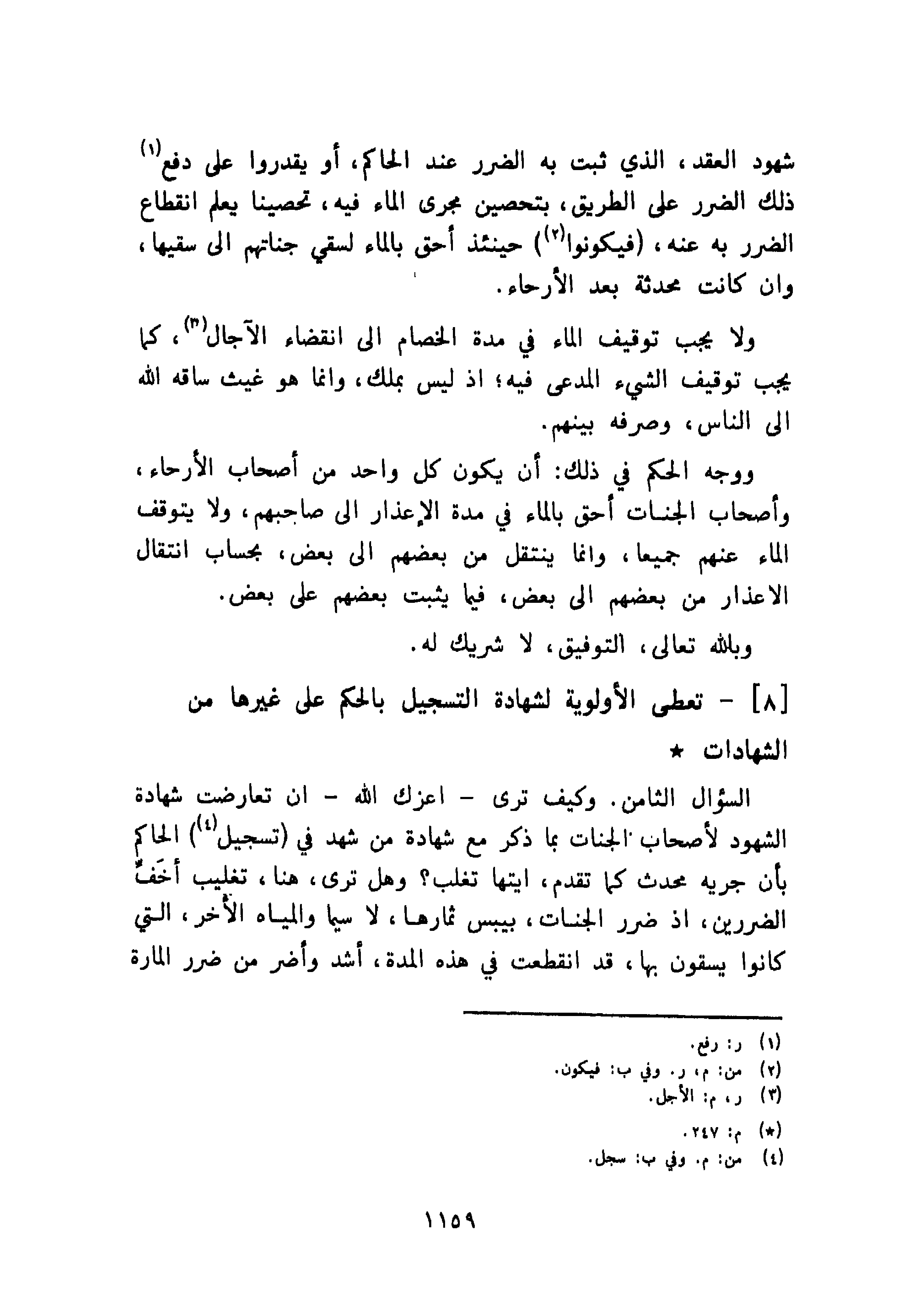 السؤال الثامن. وكيف ترى - أعزك الله - إن تعارضت شهادة الشهود لأصحاب الجنات بما ذكر مع شهادة من شهد في تسجيل الحاكم بأن جريه محدث كما تقدم، أيتها تغلب؟ وهل ترى، هنا، تغليب أخَفِّ الضررين، إذ ضرر الجنات، بيبس ثمارها، لا سيما والمياه الأخر، التي كانوا يسقون بها، قد انقطعت في هذه المدة، أشد وأضر من ضرر المارة