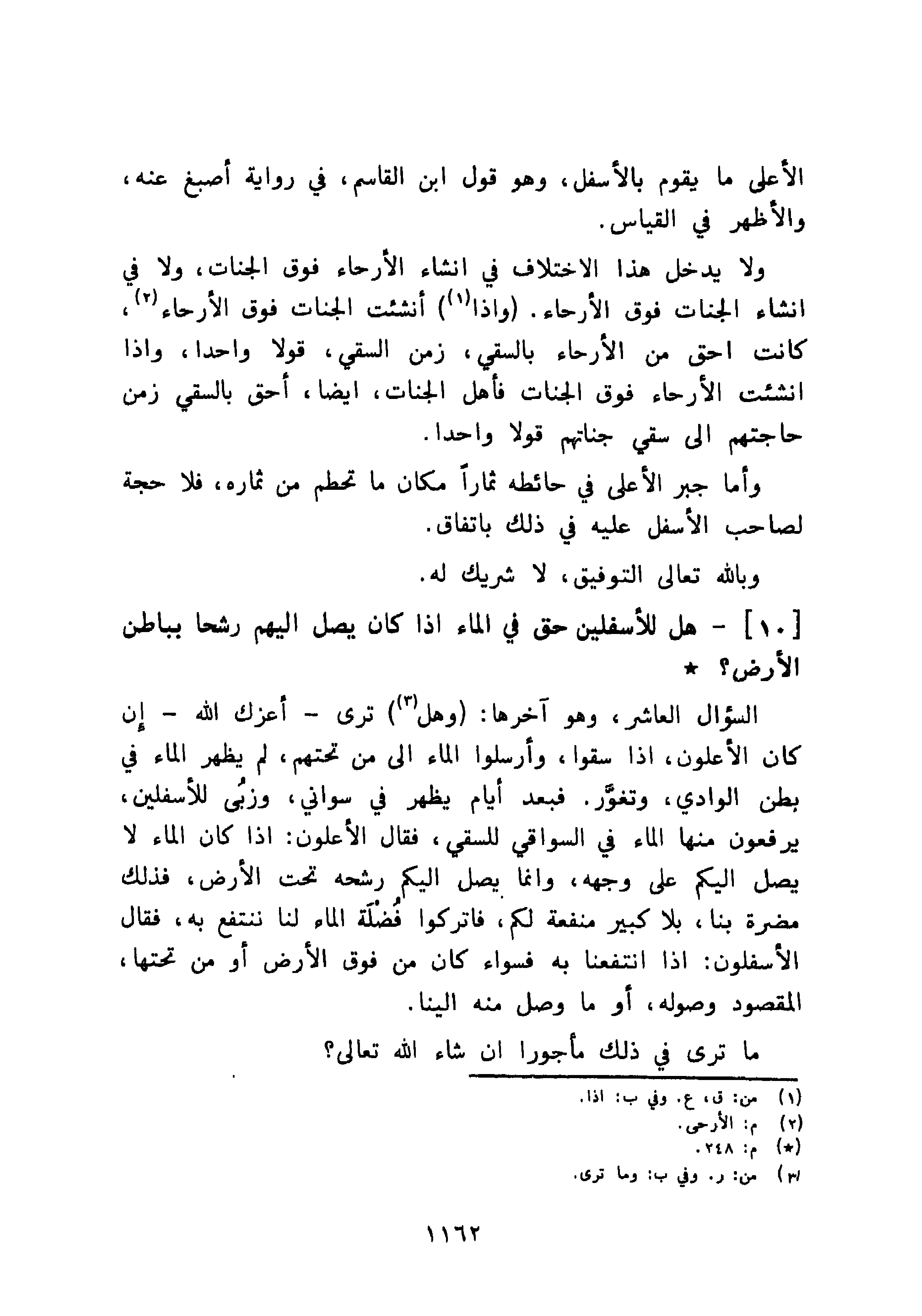 السؤال العاشر، وهو آخرها: وهل ترى - أعزك ؤالله - إن كان الأعلون، إذا سقوا، وأرسلوا الماء إلى من تحتهم، لم يظهر الماء في بطن الوادي، وتغوَّر. فبعد أيام يظهر في سواني، وزبُى للأسفلين، يرفعون منها الماء في السواقي للسقي، فقال الأعلون: إذا كان الماء لا يصل إليكم على وجهه، وإنما يصل إليكم رشحه تحت الأرض، فذلك مضرة بنا، بلا كبير منفعة لكم، فاتركوا فُضْلة الماء لنا ننتفع به، فقال الأسفلون: إذا انتفعنا به فسواء كان من فوق الأرض أو من تحتها، المقصود وصوله، أو ما وصل منه إلينا.