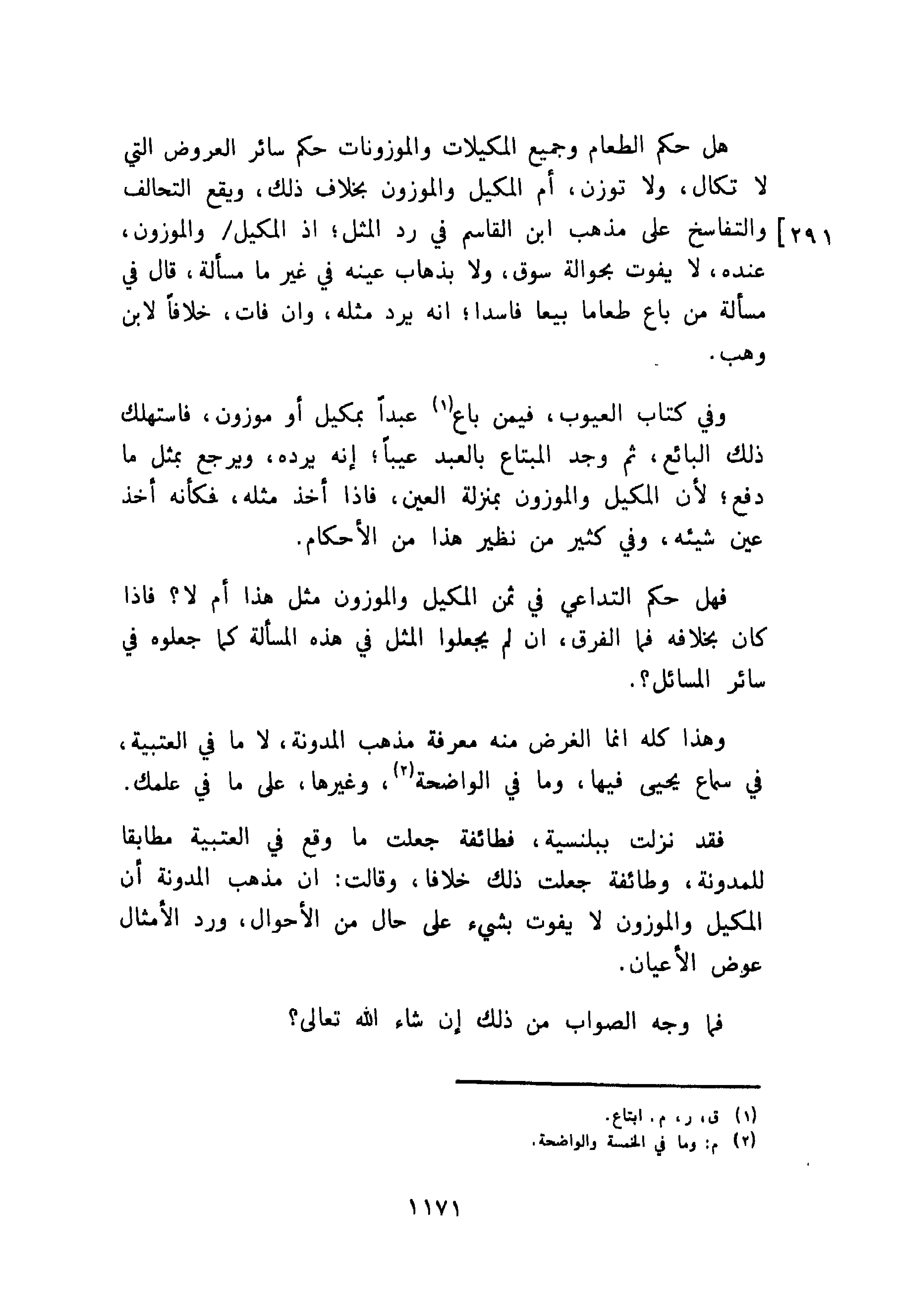 فقد نزلت ببلنسية، فطائفة جعلت ما وقع في العتبية مطابقا للمدونة، وطائفة جعلت ذلك خلافا، وقالت: إن مذهب المدونة أن المكيل والموزون لا يفوت بشيء على حال من الأحوال، ورد الأمثال عوض الأعيان.