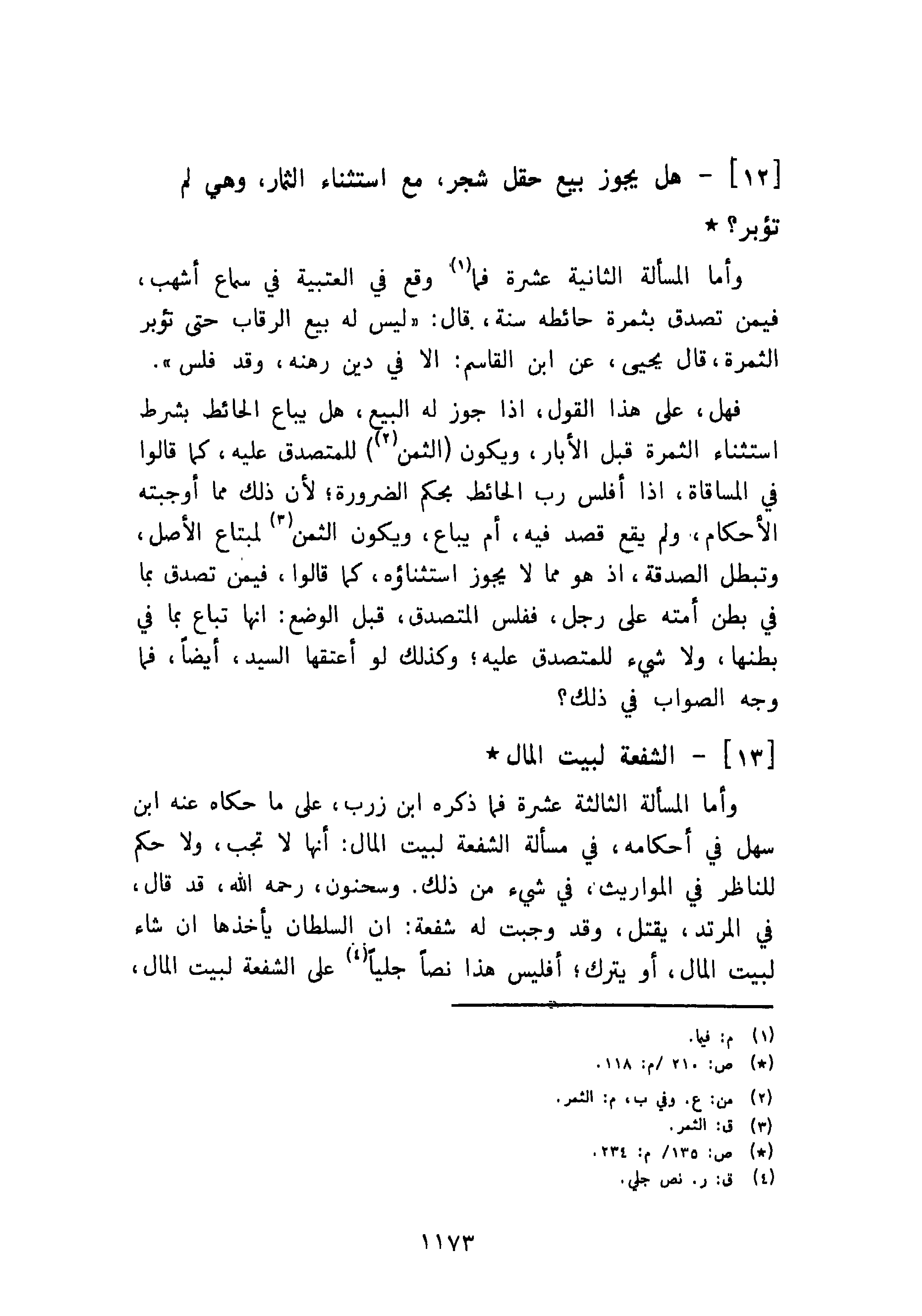 وأما المسألة الثالثة عشرة فما ذكره ابن زرب، على ما حكاه عنه ابن سهل في أحكامه، في مسألة الشفعة لبيت المال: أنها لا تجب، ولا حكم للناظر في المواريث، في شيء من ذلك. وسحنون، رحمه الله، قد قال، في المرتد، يقتل، وقد وجبت له شفعة: أن السلطان يأخذها إن شاء لبيت المال، أو يترك؛ أفليس هذا نصا جليا على الشفعة لبيت المال،