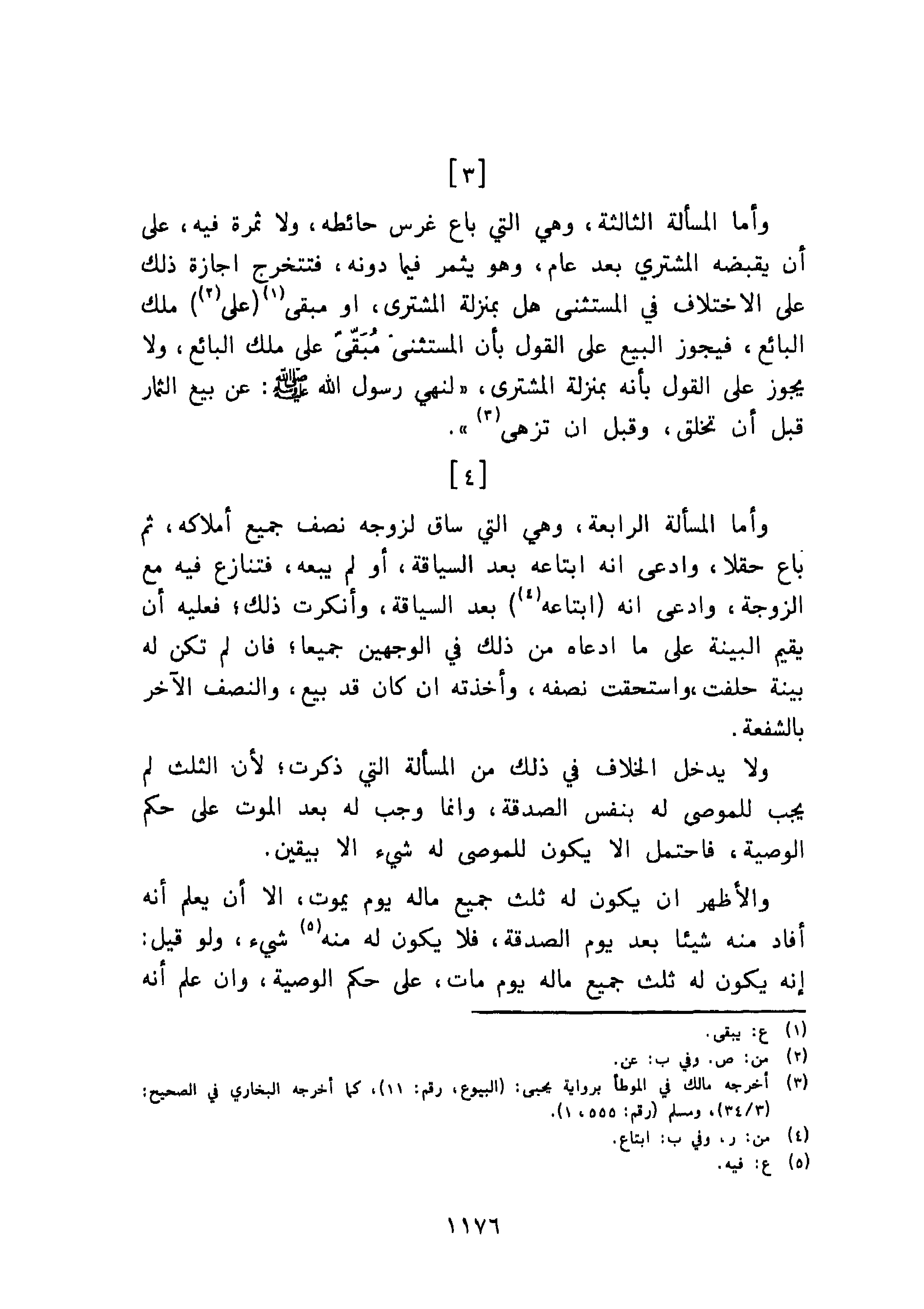 وأما المسألة الثالثة، وهي التي باع غرس حائطه، ولا ثمرة فيه، على أن يقبضه المشتري بعد عام، وهو يثمر فيما دونه، فتتخرج إجازة ذلك على الاختلاف في المستثنى هل بمنزلة المشتري، أو مبقى على ملك البائع، فيجوز البيع على القول بأن المستثنى مُبَقّيً على ملك البائع، ولا يجوز على القول بأنه بمنزلة المشتري، " لنهي رسول الله صلى الله عليه وسلم: عن بيع الثمار قبل لأن تخلق، وقبل أن تزهى ".