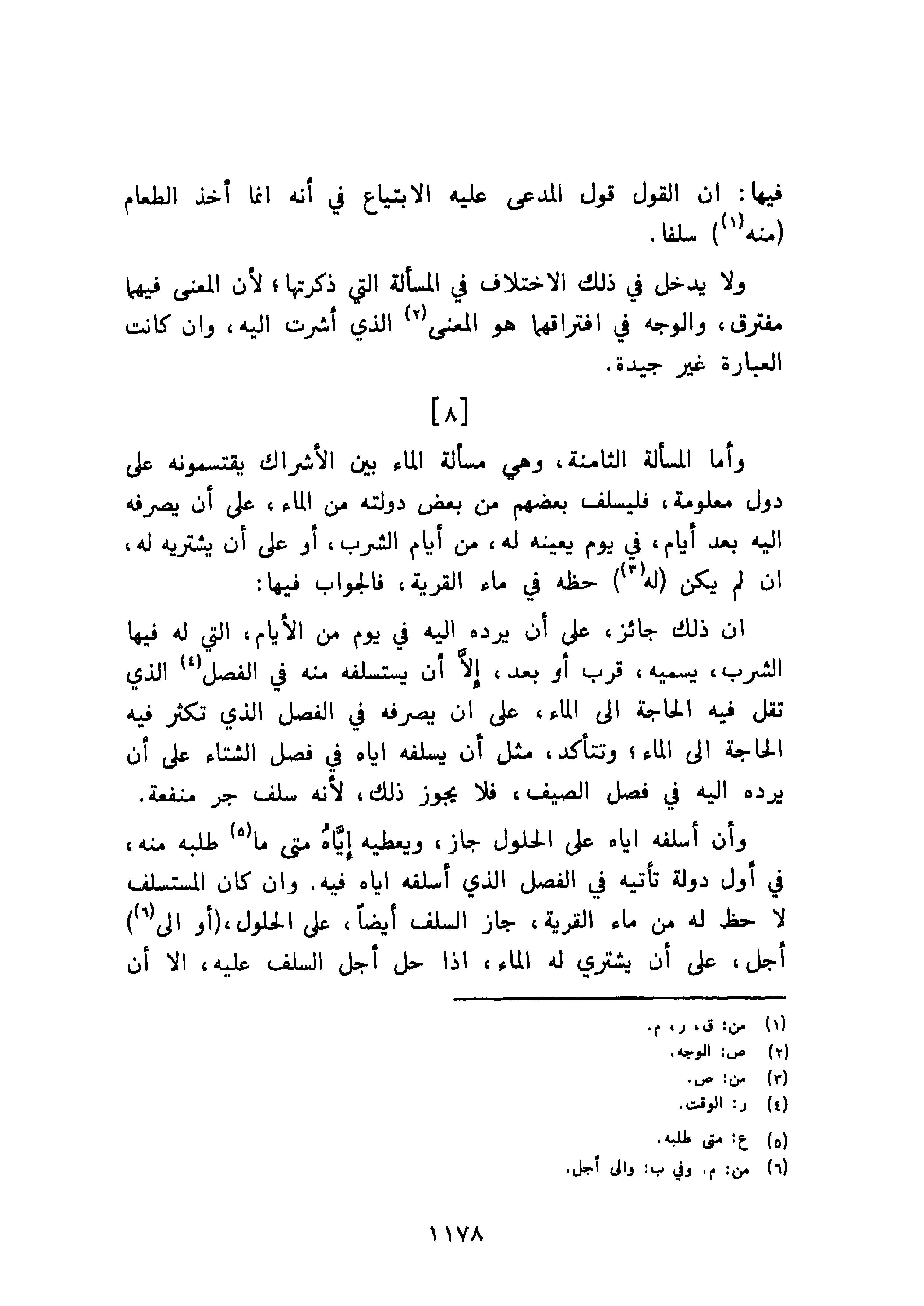 وأما المسألة الثامنة، وهي مسألة الماء بين الأشراك يقتسمونه على دول معلومة، فليسلف بعضهم من بعض دولته من الماء، على أن يصرفه إليه بعد أيام، في يوم يعينه له، من أيام الشرب، أو على أن يشتريه له، إن لم يكن له حظه في ماء القرية، فالجواب فيها: