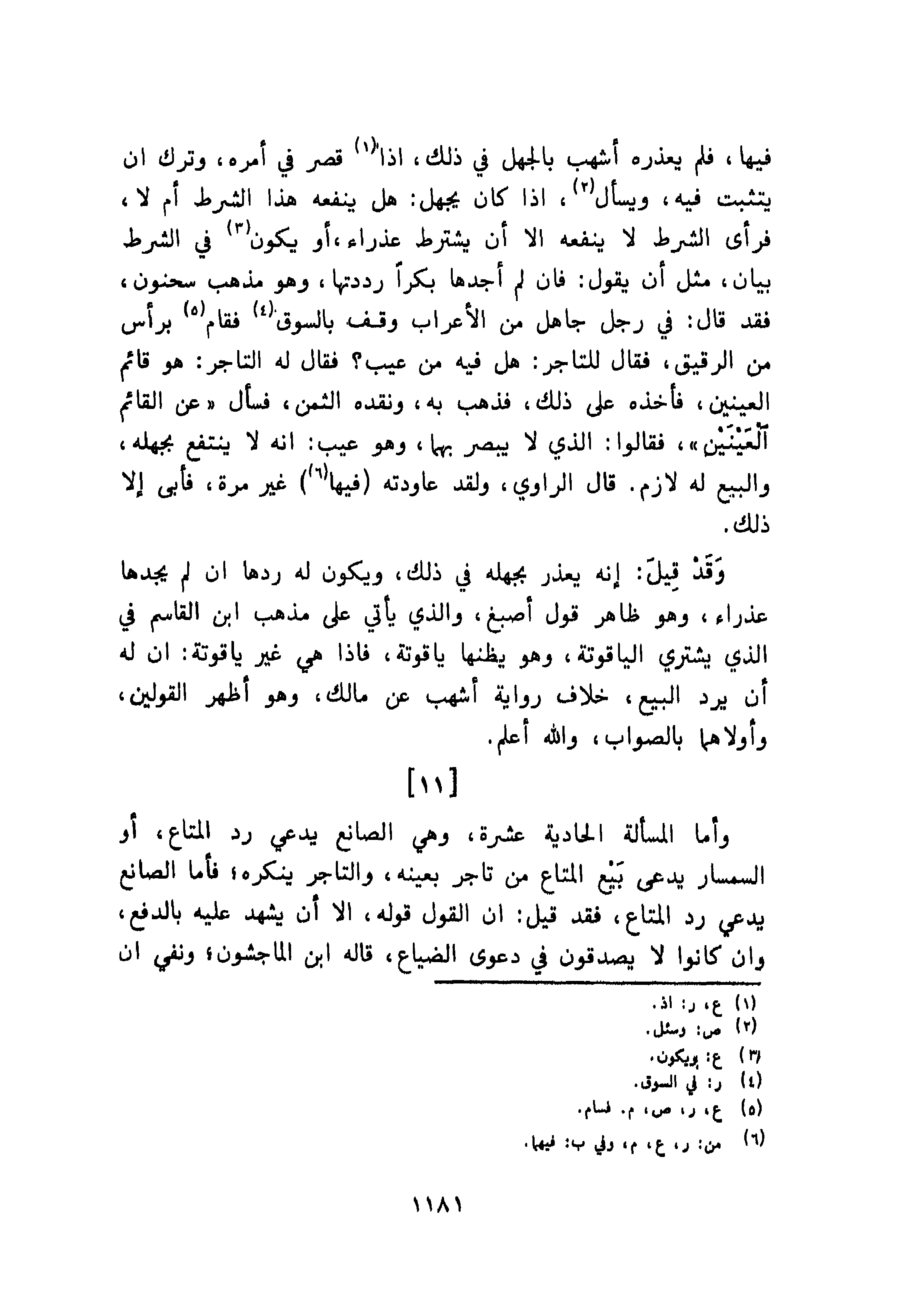 فيها، فلم يعذره أشهب بالجهل في ذلك، إذا قصر في أمره، وترك أن يتثبت فيه، ويسأل، إذا كان يجهل: هل ينفعه هذا الشرط أم لا، فرأى الشرط لا ينفعه إلا أن يشترط عذراء، أو يكون في الشرط بيان، مثل أن يقول: فإن لم أجدها بكرا رددتها، وهو مذهب سحنون، فقد قال: في رجل جاهل من الأعراب وقف بالسوق فقام برأس من الرقيق، فقال للتاجر: هل فيه من عيب؟ فقال له التاجر: هو قائم العينين، فأخذه على ذلك، فذهب به، ونقده الثمن، فسأله " عن القائم الْعَيْنَيْن "، فقالوا: الذي لا يبصر بهما، وهو عيب: أنه لا ينتفع بجهله، والبيع له لازم. قال الراوي، ولقد عاودته فيها غير مرة، فأبى إلا ذلك.